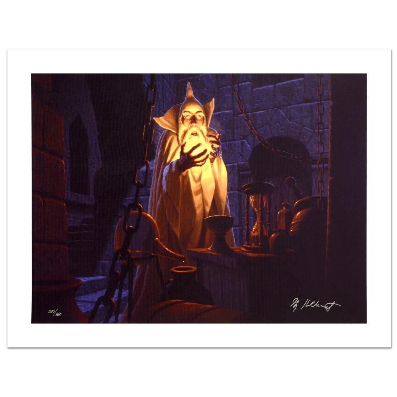 Known world wide for their fantasy and science fiction illustrations, identical twin brothers Greg and Tim Hildebrandt created an abundance of fascinating artwork, most notably their illustration work for J.R.R. Tolkien's 'The Hobbit' and 'Lord of the Rings'. "Saruman And The Palantir", originally created in the 1970's for Ballantine Books, is a limited edition giclee on canvas, numbered and hand signed by Greg Hildebrandt! Includes Certificate of Authenticity! Measures approx. 28" x 21" (image). Retail Price $995.00. PRICE INCUDES FREE SHIPPING IN THE U.S. - SHIPPING WILL BE ADDED TO YOUR INVOICE FOR ALL BUYERS OUTSIDE OF THE U.S.