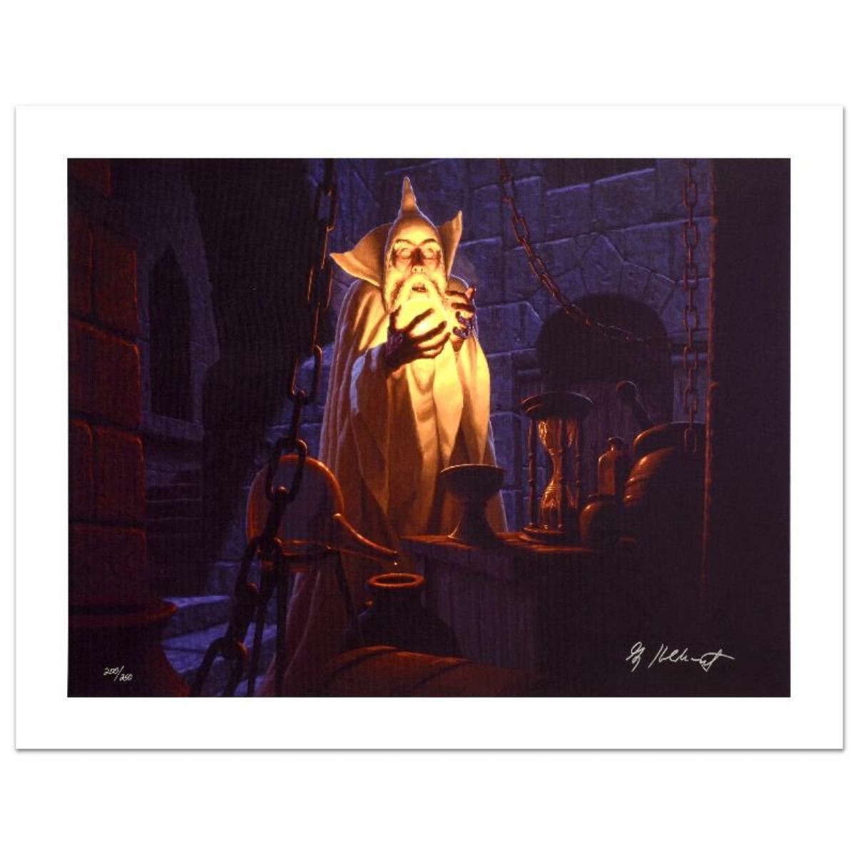 Known world wide for their fantasy and science fiction illustrations, identical twin brothers Greg and Tim Hildebrandt created an abundance of fascinating artwork, most notably their illustration work for J.R.R. Tolkien's 'The Hobbit' and 'Lord of the Rings'. "Saruman And The Palantir", originally created in the 1970's for Ballantine Books, is a limited edition giclee on canvas, numbered and hand signed by Greg Hildebrandt! Includes Certificate of Authenticity! Measures approx. 28" x 21" (image).