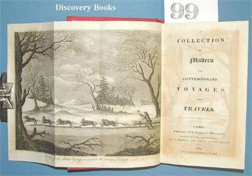 Sarytschew, Gawrila. ACCOUNT OF A VOYAGE OF DISCOVERY TO THE NORTH-EAST OF SIBERIA, THE FROZEN OCEAN, AND THE NORTH-EAST SEA. London: Richard Phillips 1806-07 (published in two parts) iv,(5)-70(2); (2)-80pp. Five plates, 3 of which are folded, the other two in hand color. Recent cloth. This copy contains the original title leaf for a 1810 volume of Phillips' "A Collection of Modern and Contemporary Voyages and Travels", but the indiviadual title leaves for the two parts of the Sarytschew narrative have been supplied in facsimile. The original text & plates are very good & clean.