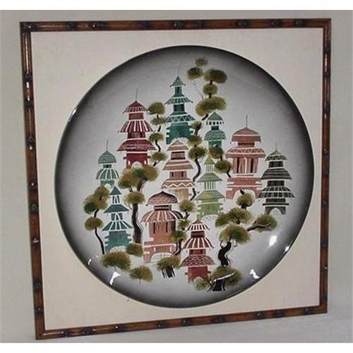 A large, 17" diameter, Sascha Brastoff charger in the Pagoda pattern, signed Sascha B. This one has been mounted on a fabric covered framed board, 20 1/4' square. The condition is good, although it has been mounted on the board. There is crazing, but no chips or cracks. (7)
