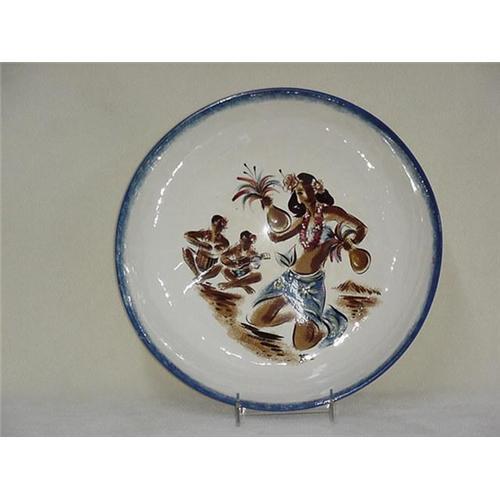 Hawaiian dancer and musicians pictured in bottom of 13'' diameter x 4 1/2'' tall bowl. Signed ''SASCHA B.'' on image. This signature was produced by hand scratching the wet paint before firing. Very large, impressive piece. Except for slight surface imperfections, this item is in wonderful condition.