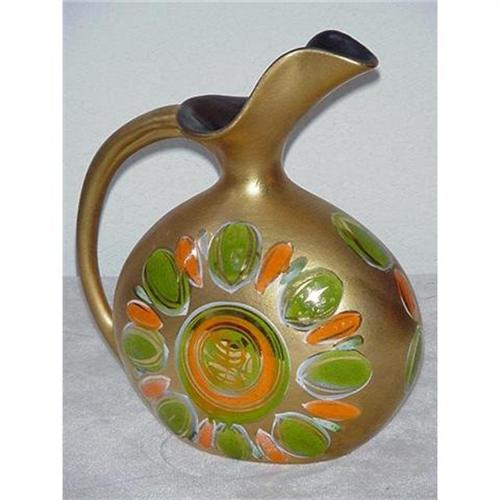 An interesting Sascha Brastoff "Orange & Gold" pitcher, 10 1/2" tall, 9" wide and 4" deep. A good looking piece of very good size and in very good condition, just a slight few surface blemishes but no chips or cracks. Signed as shown. (3)