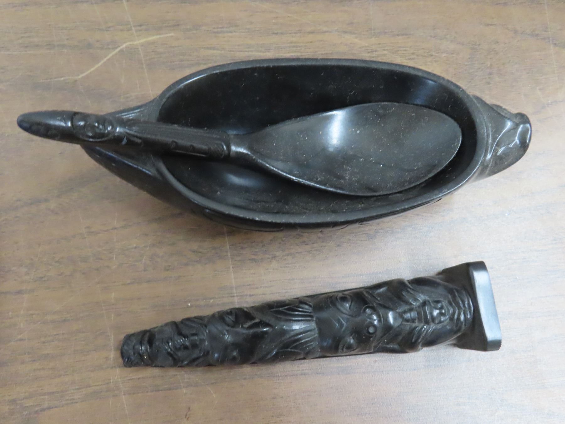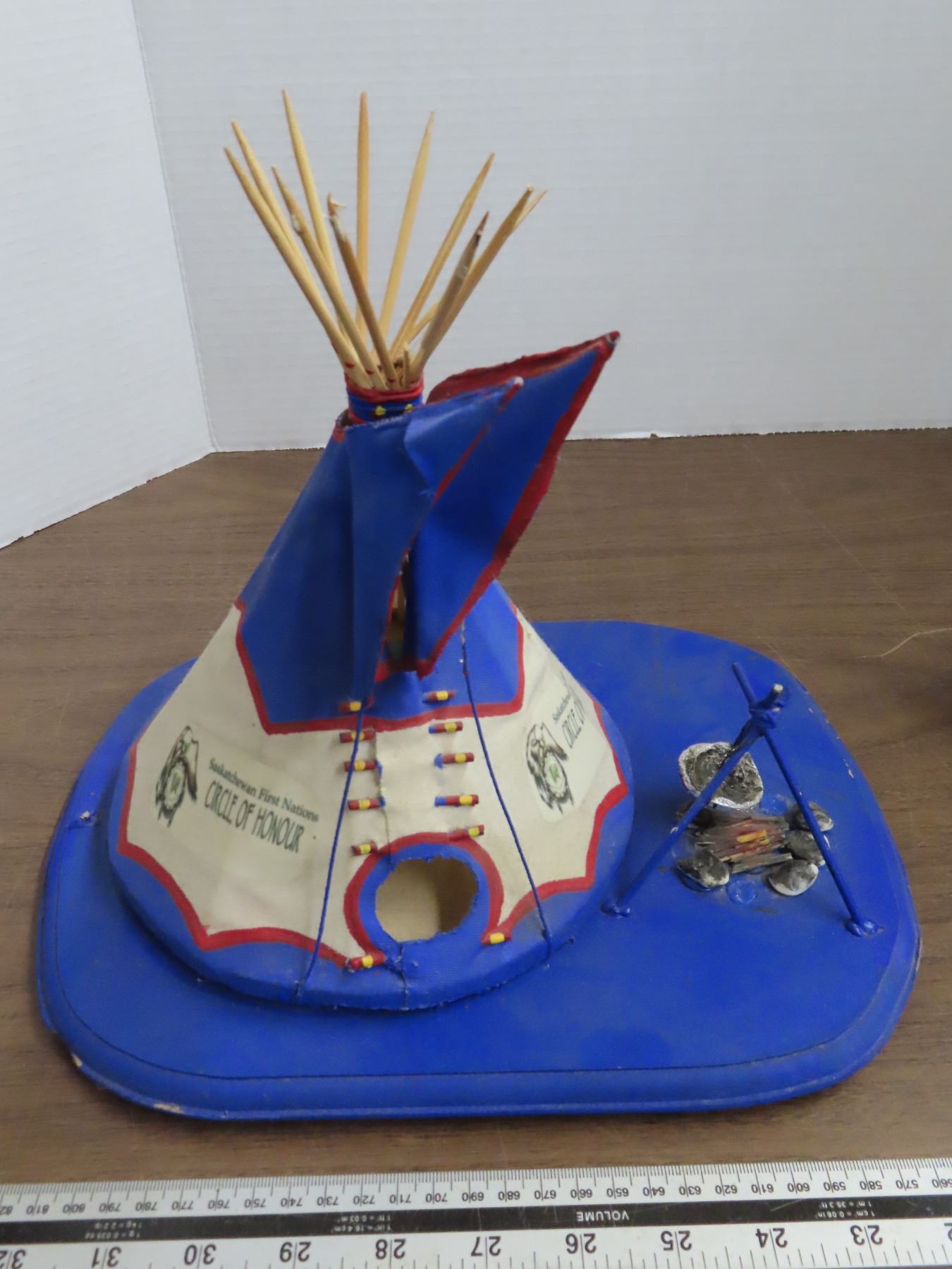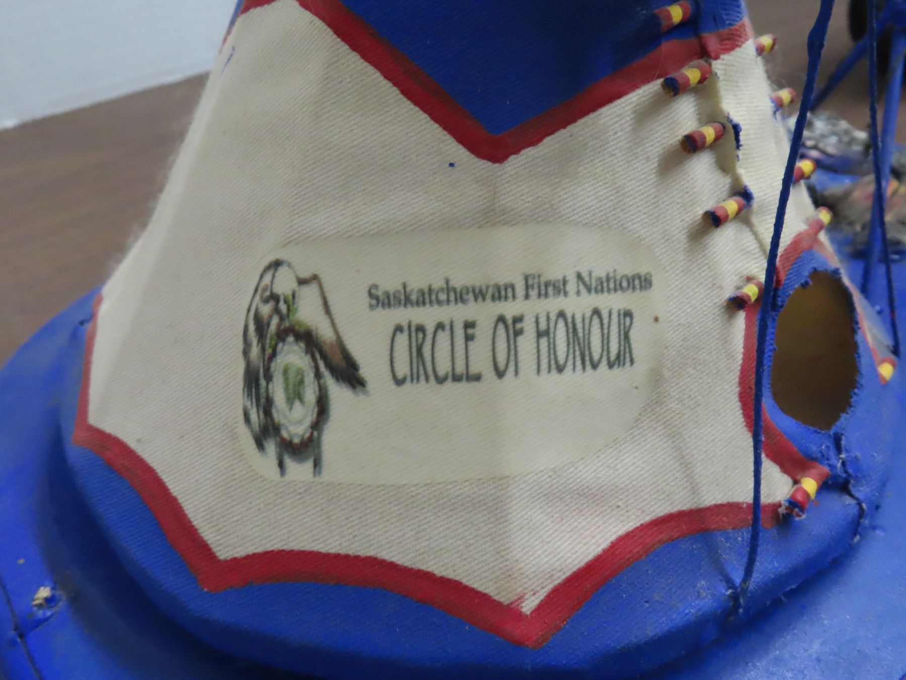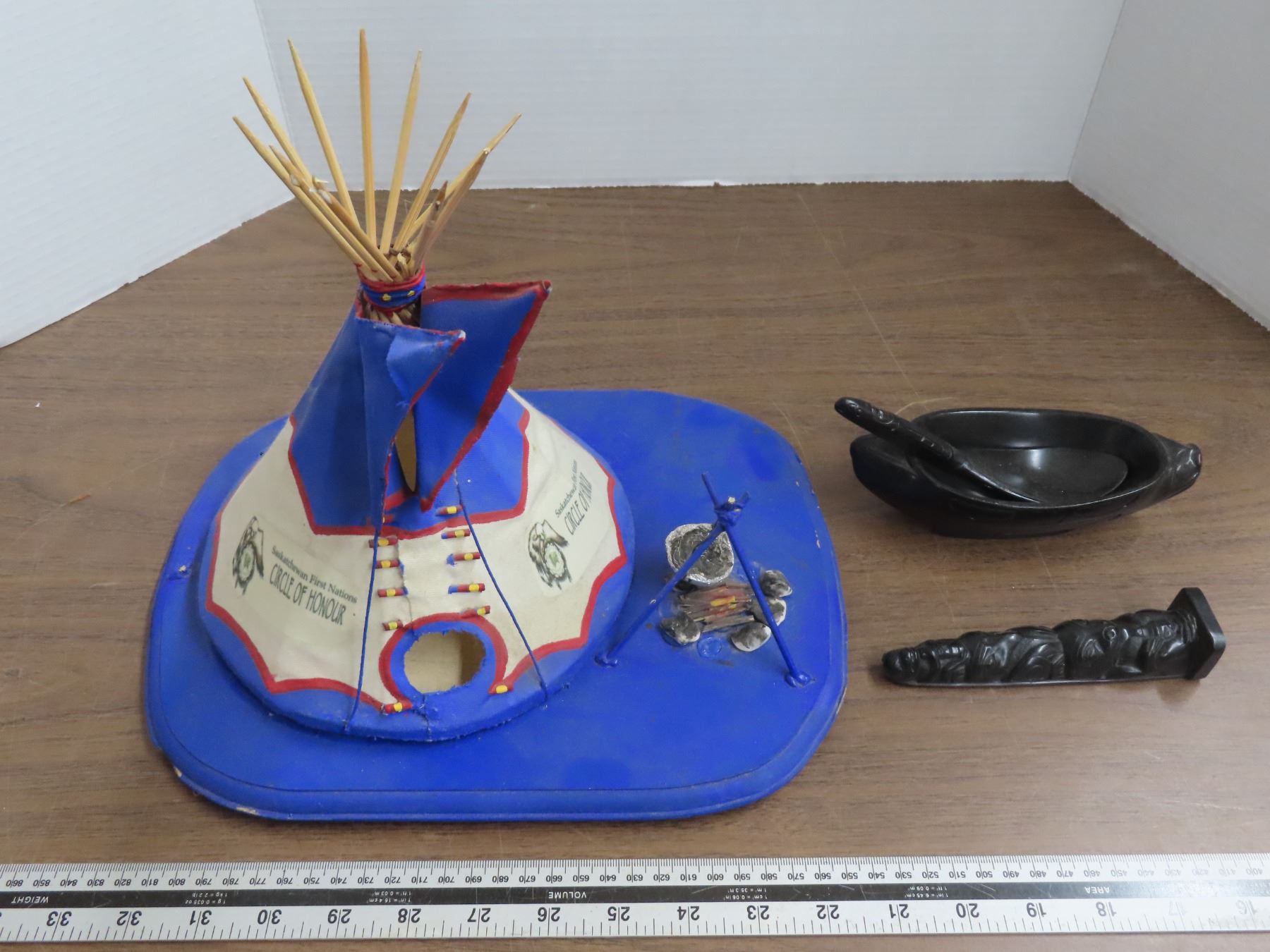 Sask. First nations circle of honor and west coat native pearlite canoe bowl with spoon and Haida totem pole