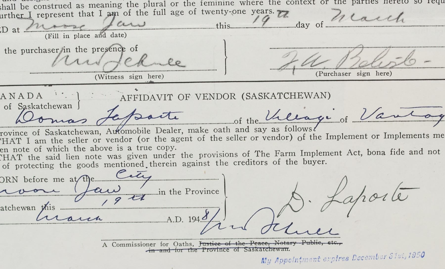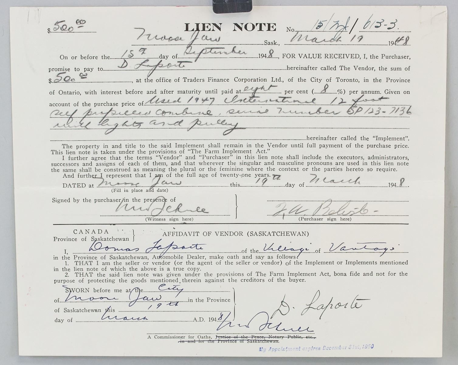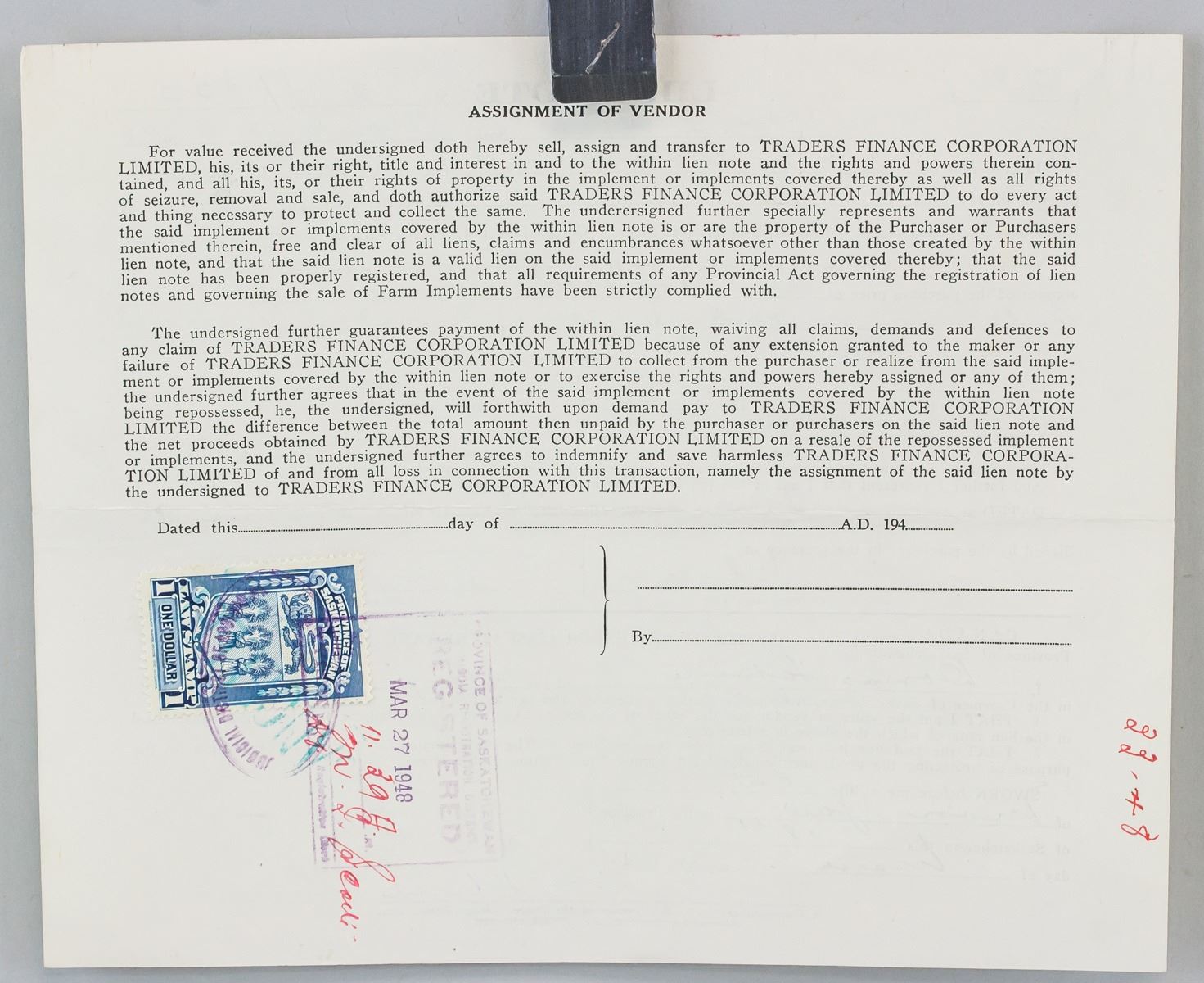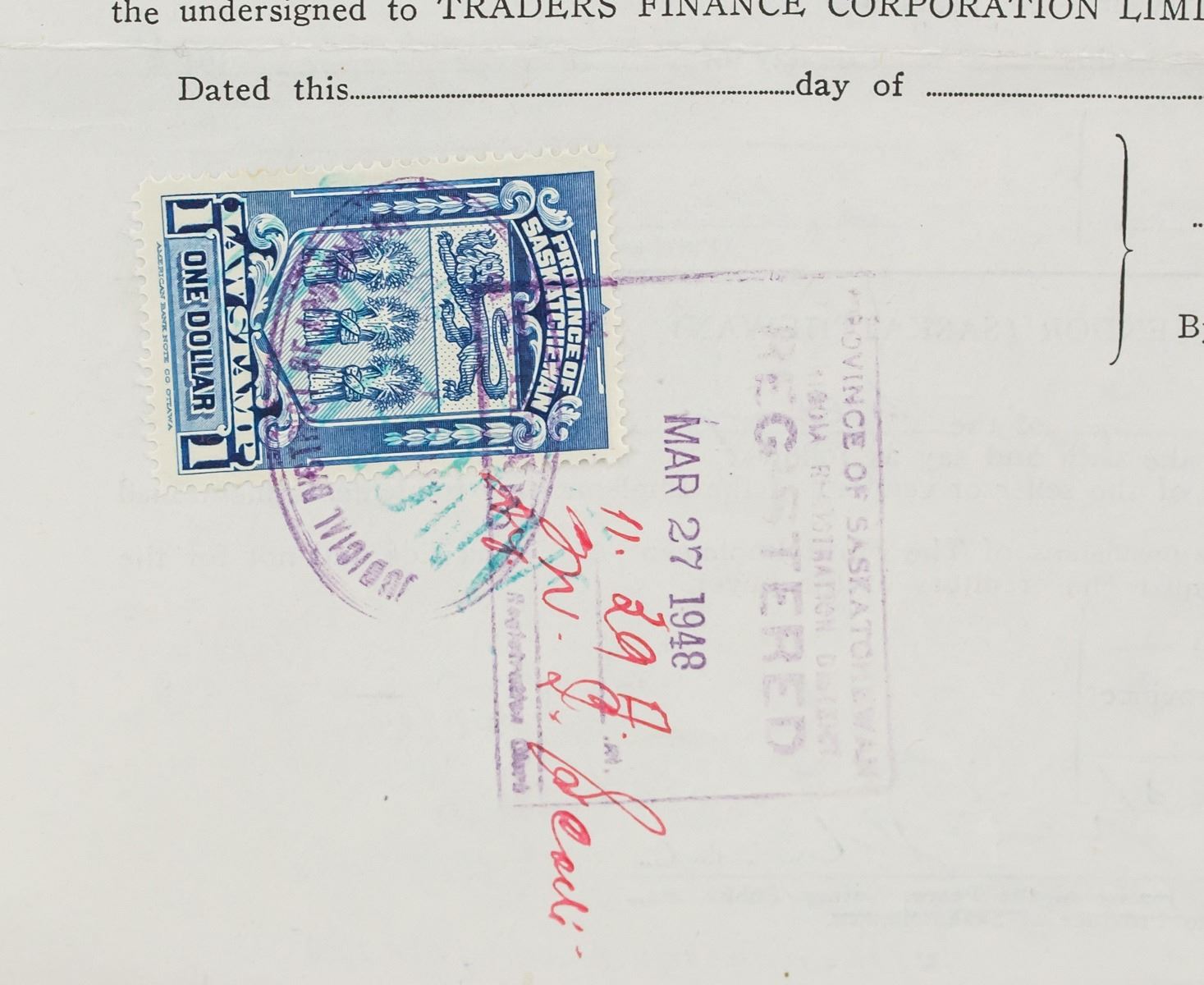 One (1) Saskatchewanian stamp. 1 Dollar. On Lien Note dated March 19, 1948. 17.5 x 21 cm, stamp size: 4 x 2.8 cm