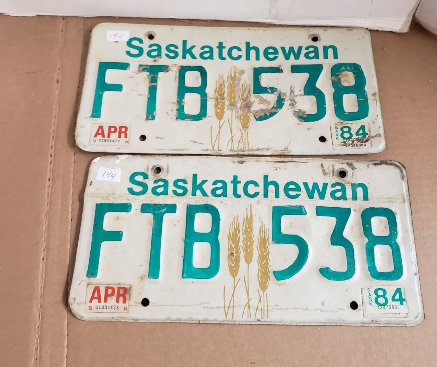 Saskatchewan License Plate 1984 matching pair