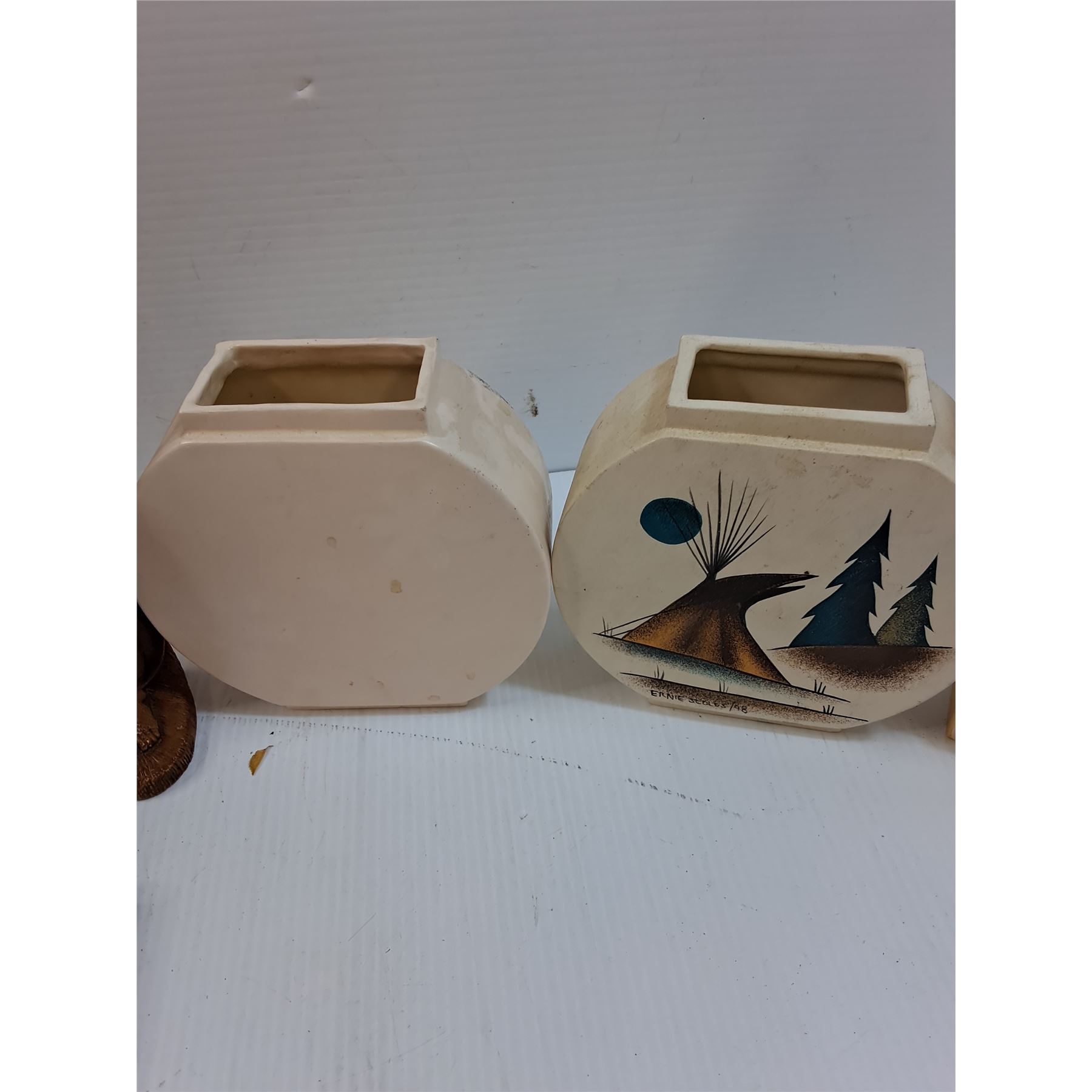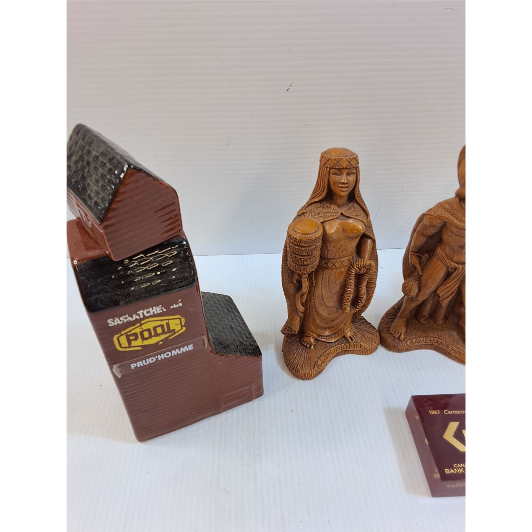 Saskatchewan Pool Decanter, Prud Homme, (2) Carved Figurines, (2) Vases, Alberta Pool Coin Bank