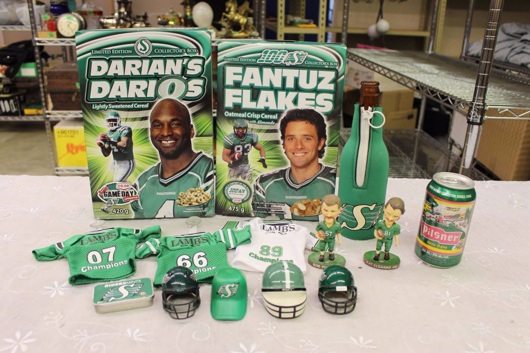 Saskatchewan Roughrider Collection (Bobble Heads, Darian's Darioes, Fantuz Flakes, Mints, Helmets, Etc;)
