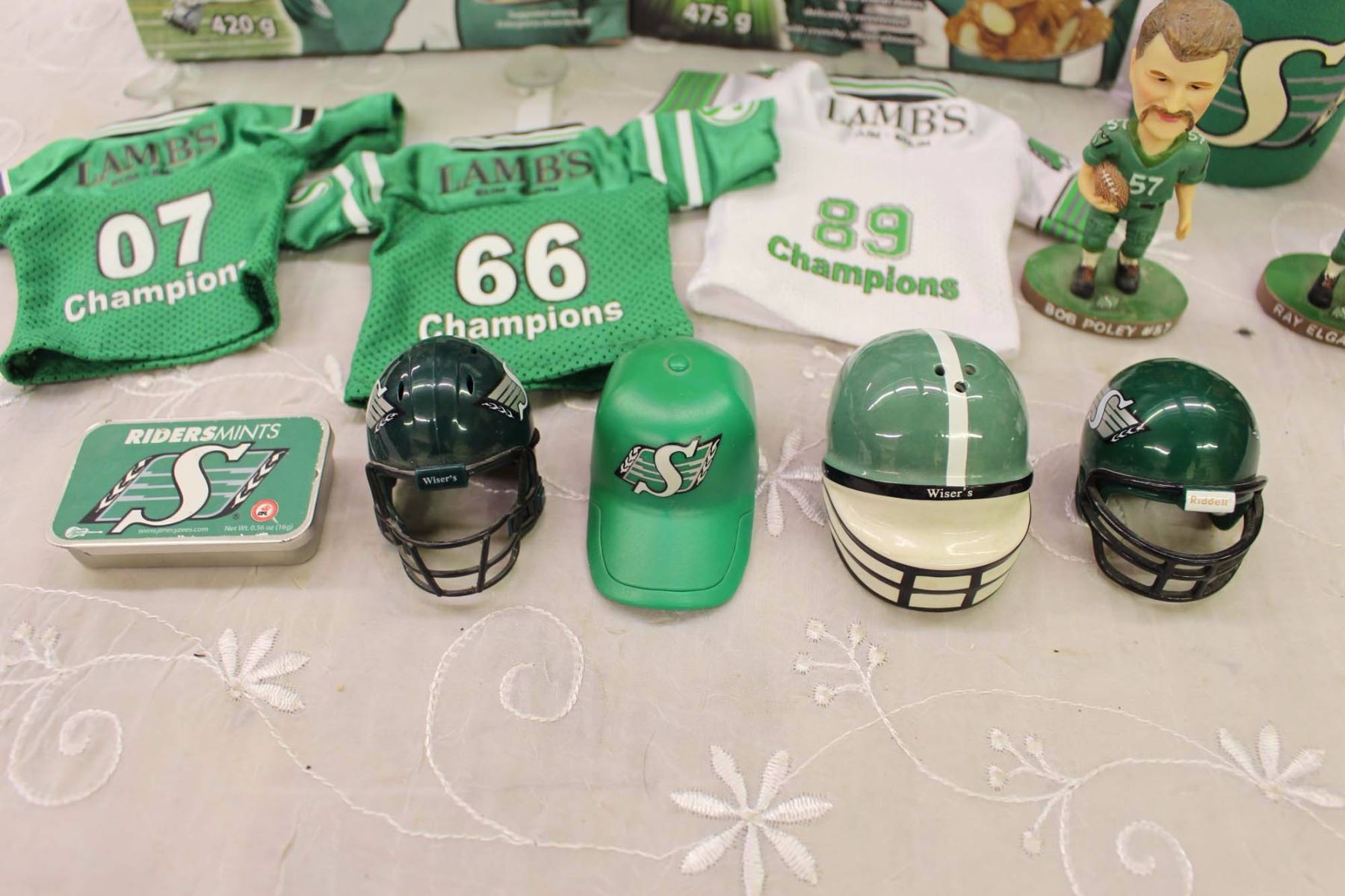 Saskatchewan Roughrider Collection (Bobble Heads, Darian's Darioes, Fantuz Flakes, Mints, Helmets, E