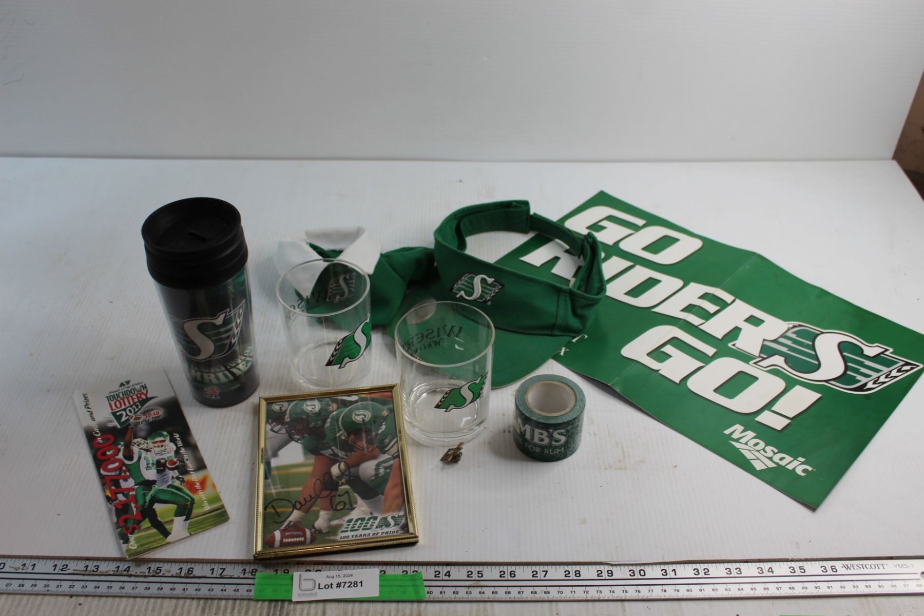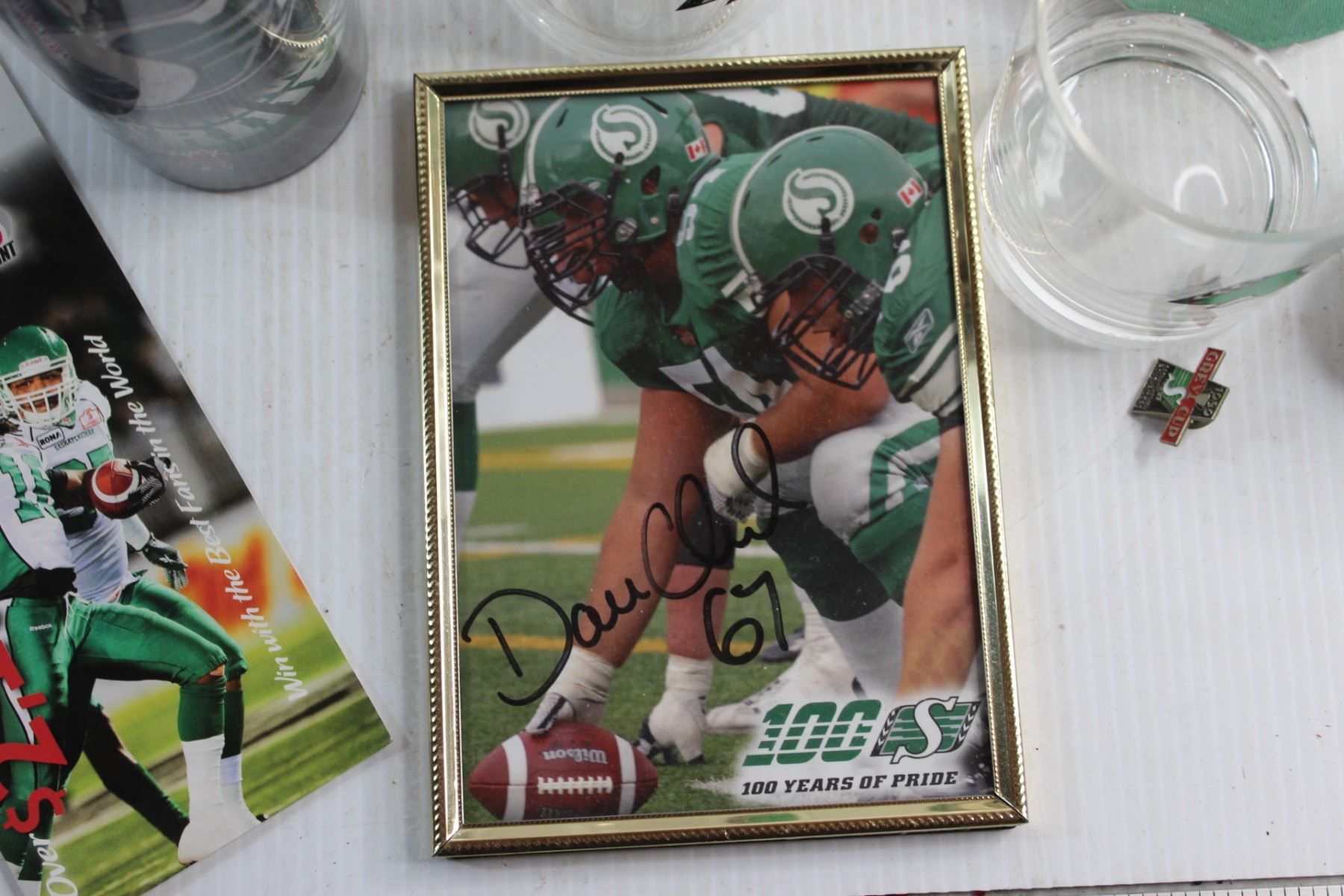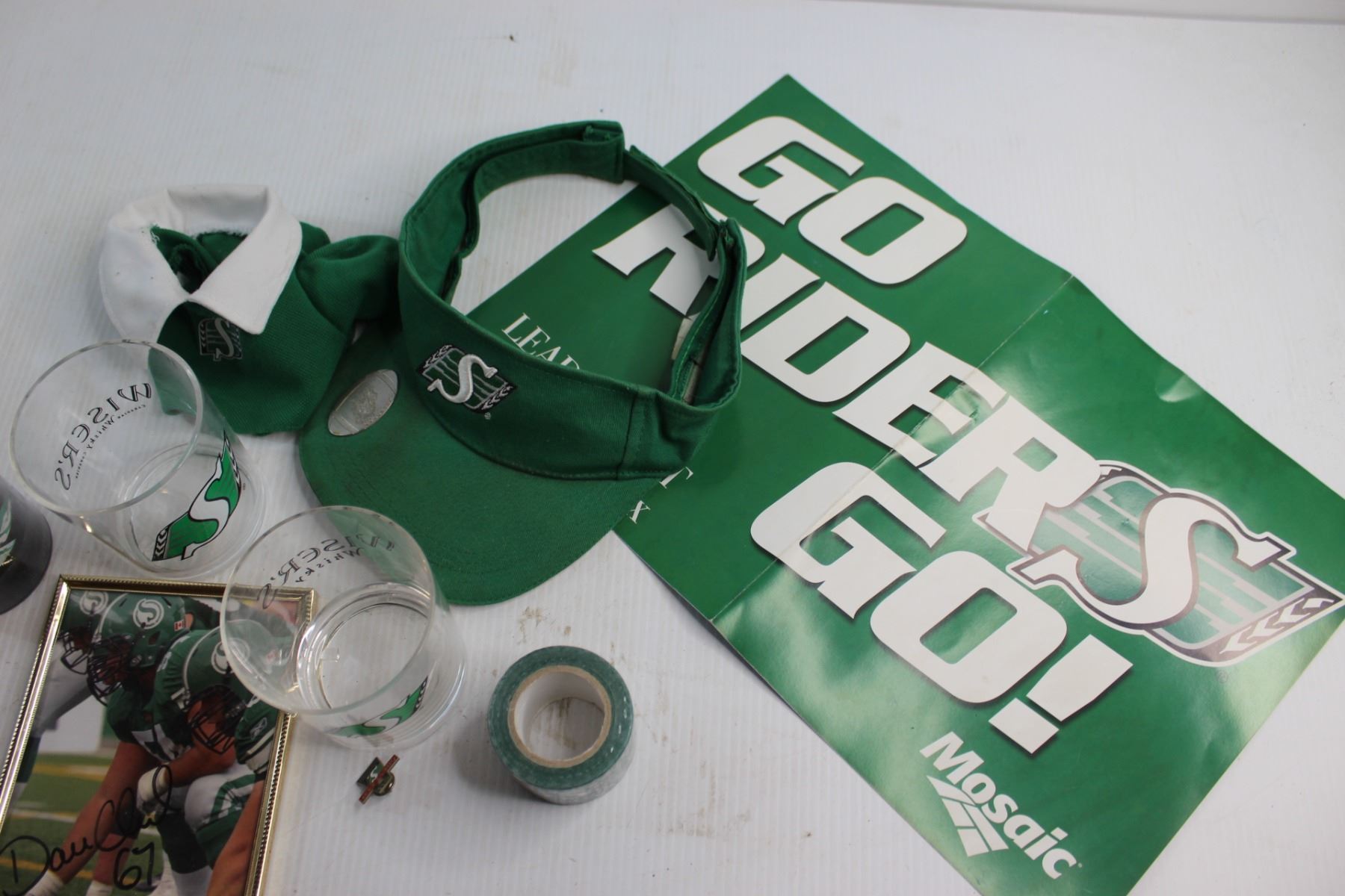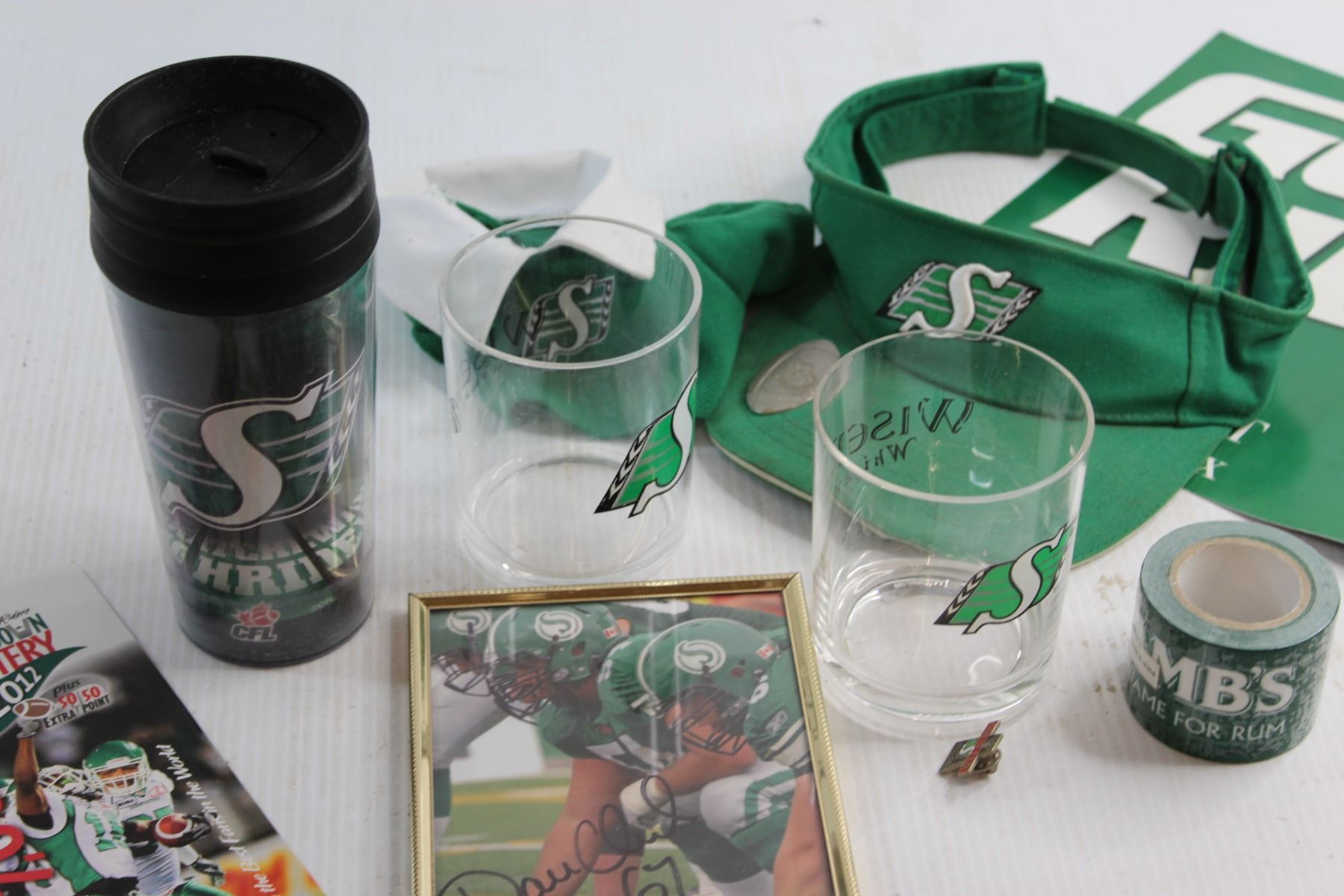 Saskatchewan Roughriders Signed Print 5'' x 7'', (2) Glasses and Assorted Items