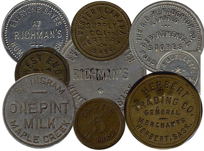 Saskatchewan. Various dairy and merchant tokens from the following locals: Aberdeen, Annaheim, Battleford, Biggar, Birch Hills, Briarcrest, Bruno. (47 pieces)