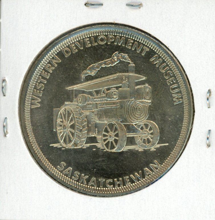 Saskatoon Western Development Museum medal depicting an old automobile and thrashing machine. BU.
