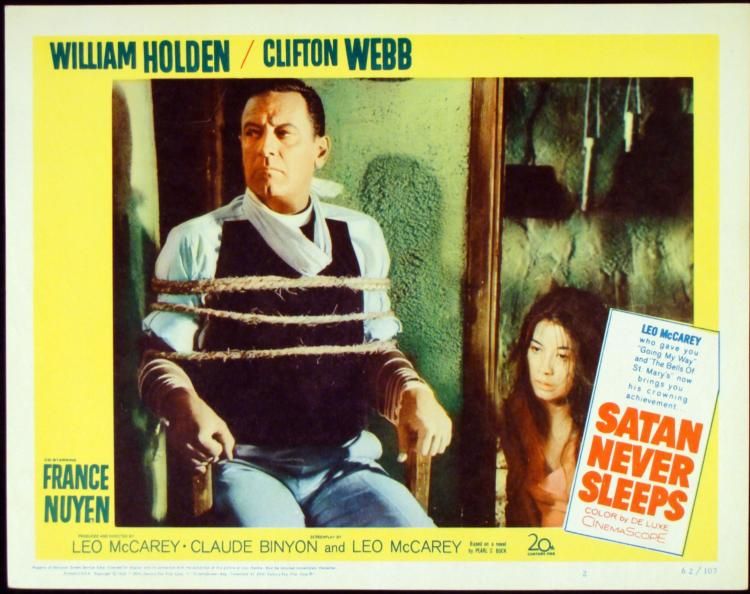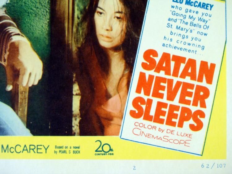 Here is an original lobby card from the 1962 movie "Satan Never Sleeps." William Holden stars as a Lieutenant Colonel running a special forces unit, and he looks good in this stylish poster. Size: 14 x 11 inches Condition: Excellent