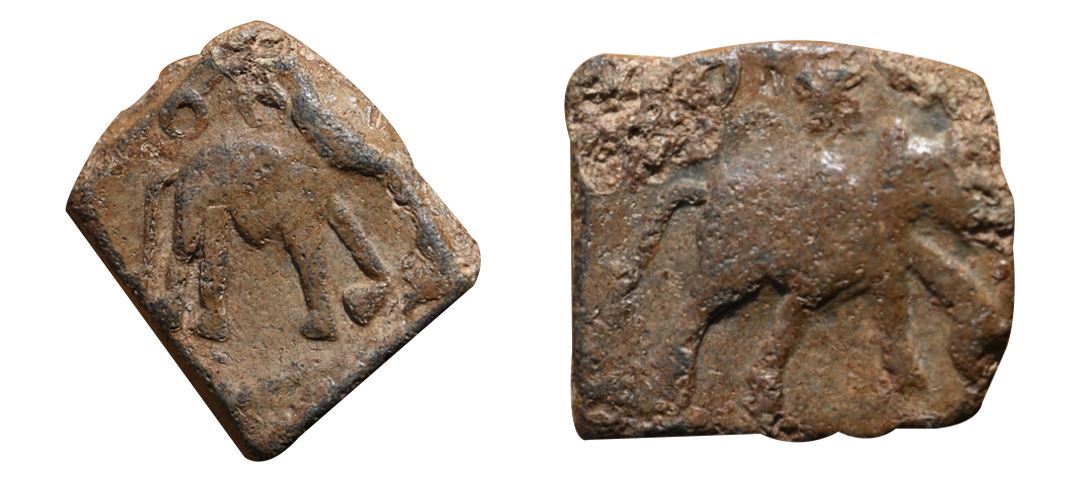 Satavahana, 100-200 CE, Paithan- Newasa region, Uninscribed type, Lead, 3.95g, Obv: Elephant to right with Ujjain symbol above, Rev: Elephant walking to right with swastika above. Fine, Scare