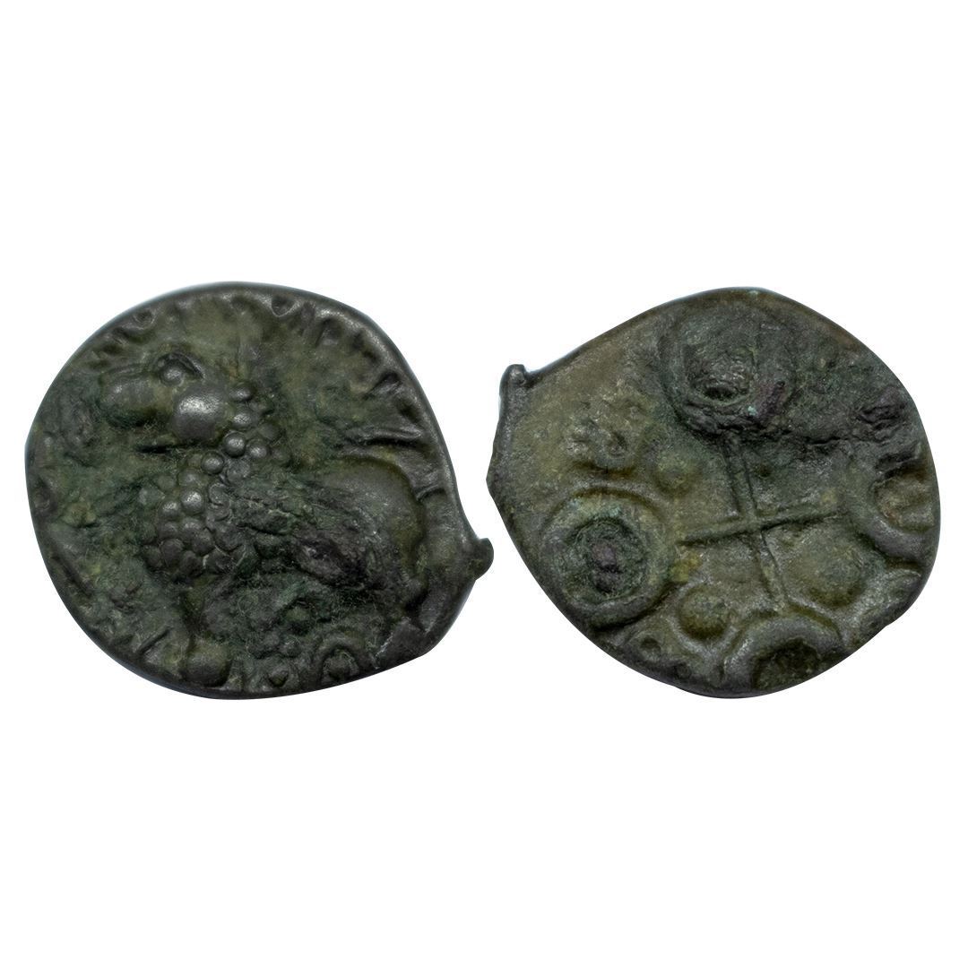 Satavahana Dynasty, Sri Satakarni (100-50 BC), Potin Unit, 3.37 gms, Junnar Lion type, Obv: a maned lion standing facing the left, with a three-arched hill (chaitya) between its legs, a sacrificial Yupa on a platform in front partly visible, the Brahmi legend "Rano Siri Satakanisa" around, Rev: An Ujjaini symbol with Nandipadas in each quadrant, Mitch. K&A # 112, fine, Scarce.