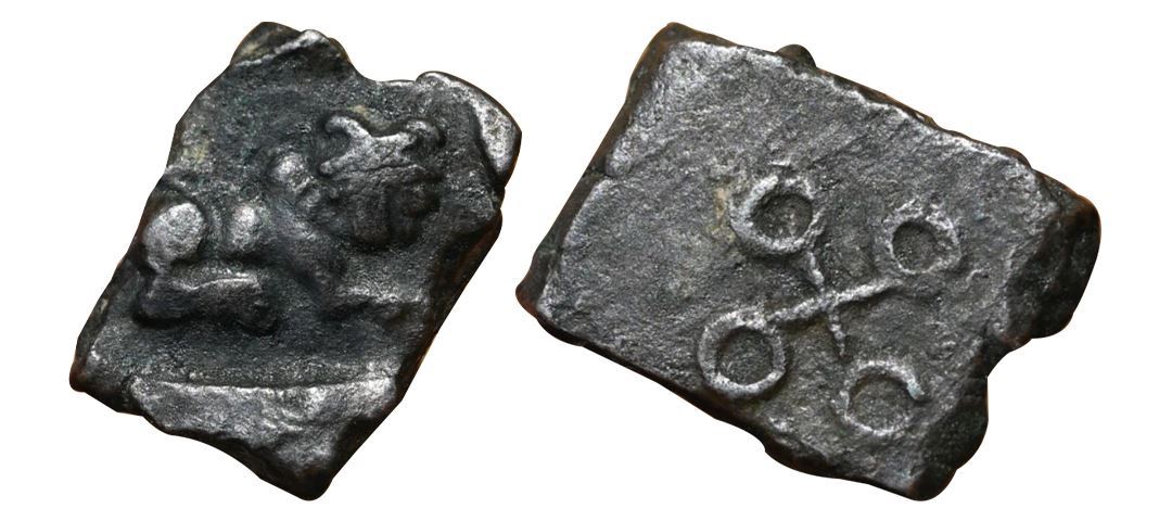 Satavahana, Paithan- Newasa region, Uninscribed type, Copper, 1.19g, Obv: in square frame Lion sitting to right, Rev: Ujjain symbol. Fine, rare.