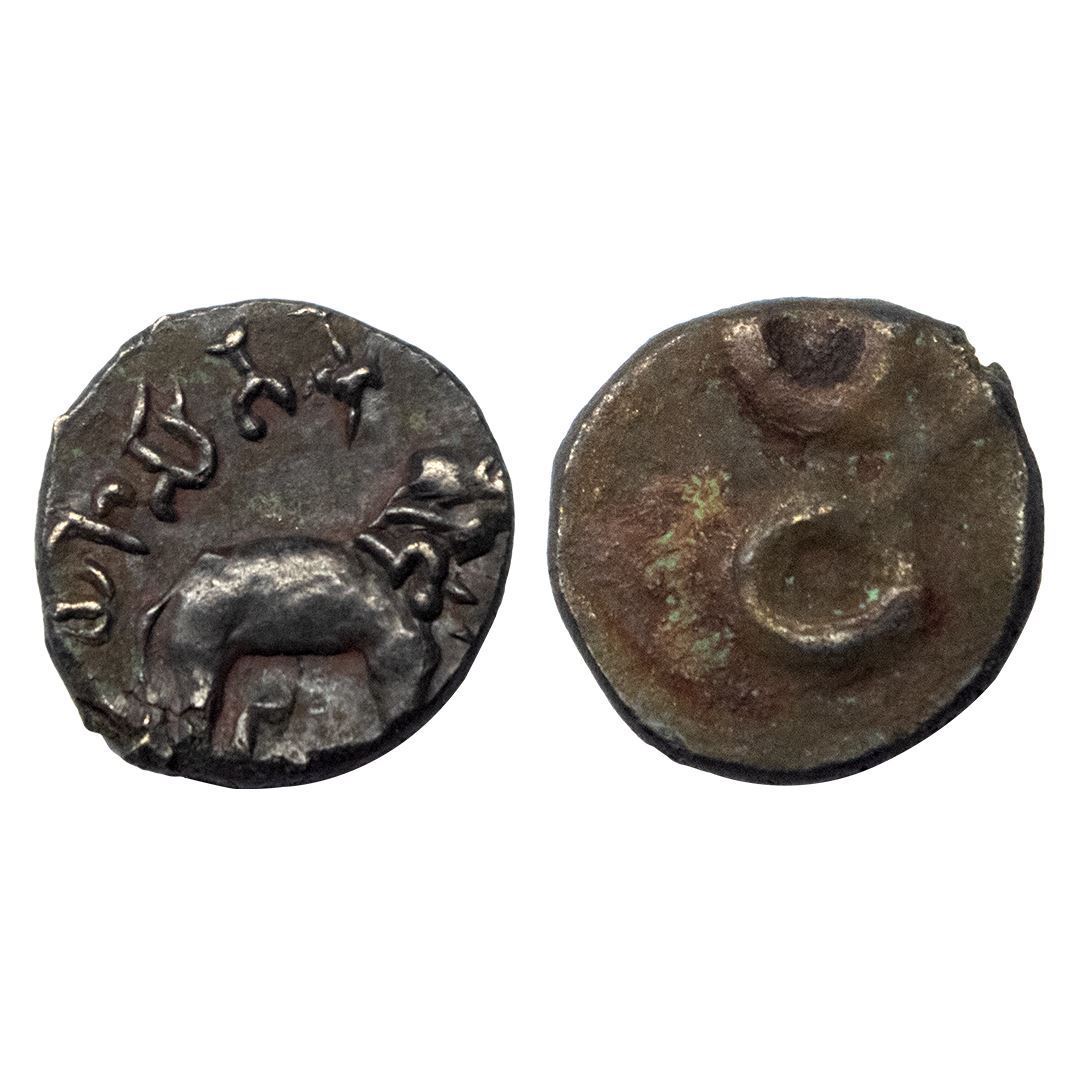 Satavahanas, Gautamiputra Yajna Satakarni (170-200 CE), Potin Unit, 3.06 gms, Universal type, obv. Elephant to right with trunk raised, Brahmi legend on its back reading ‘(Rano Si)riYana Sataka(nisa)’, Rev. Ujjain symbol, Pieper # 2742, very fine, scarce.