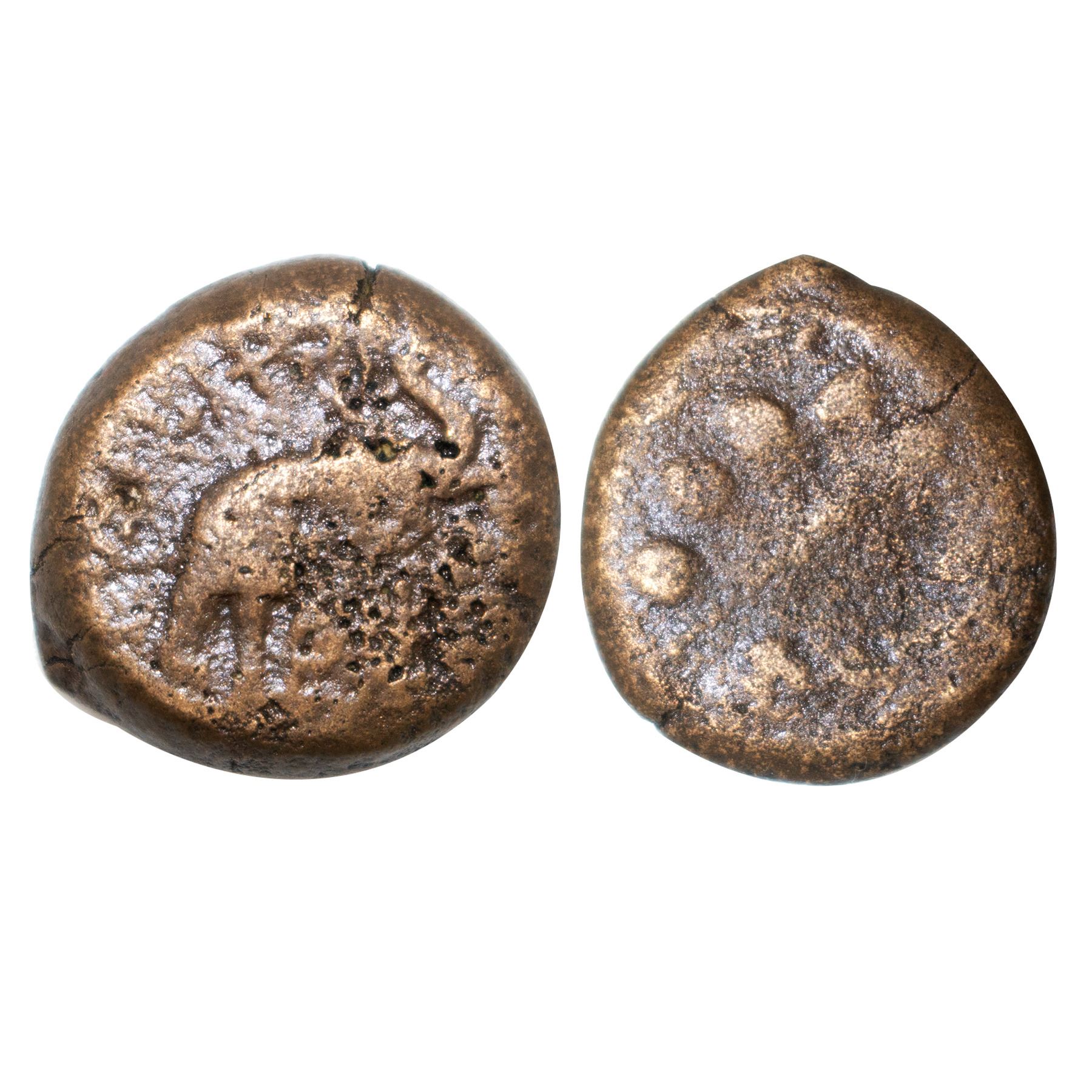 Satavahanas, Kausikiputra Siri Satakarni, Brass Heavy Unit, 16.30grms, OBV: Elephant walking to right side with trunk upraised and around traces of Brami legend mentioning ruler name, REV: Tree-in-railing with bold leaves. (I.K. Sharma # pl. IV). Very fine