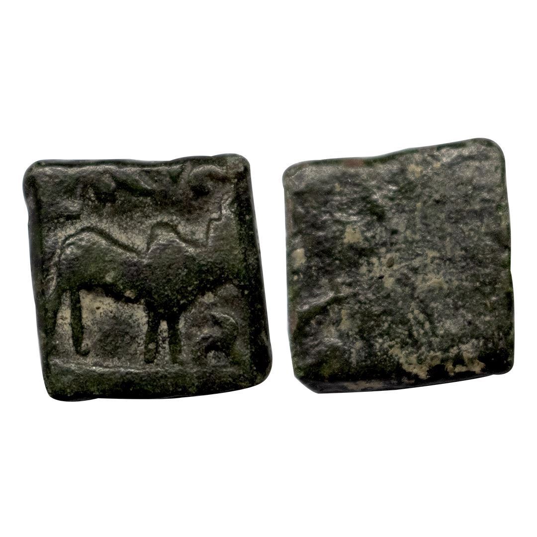 Satavahanas, Kochchiputra (c. 100 BC), Newasa-Paithan Region, Copper Unit, 3.21 gms, Obv: bull right traces of legends above rajno kochiputasa siri satakanisa, Rev: traces of tree-in-railing, Pieper # 657, fine, scarce.