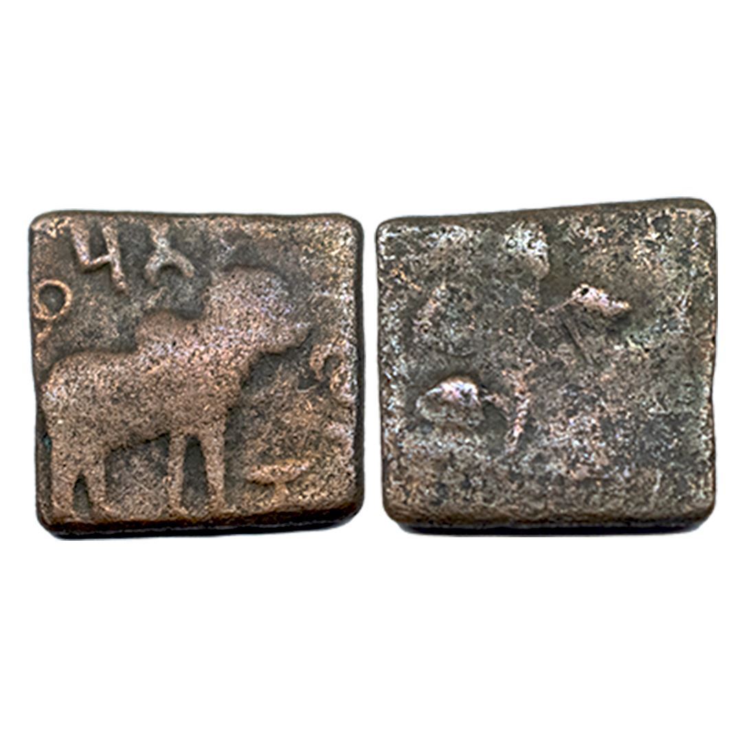 Satavahanas, Kochhiputra Siri Satakarni (c. 60-40 BC), Newase-Paithan Region, Copper Unit, 2.88Grms, OBV: Humped bull standing facing to right side with Brahmi legend ‘…putasa..takani..’, REV: Tree-i-railing with broad leaves. (Pieper # 2628). Fine+.