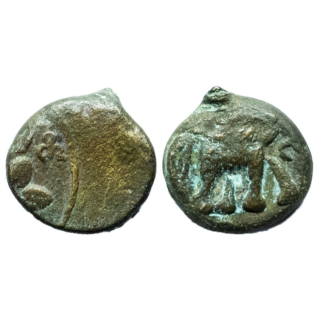 Satavahanas, KosikiputaSiriSatakani (c.50-30BC), 'Elephant' type, Newase-Paithan Region, Copper Unit, 5.24Grms, Obv: Elephant marching to right with trunk raised, around traces of Brahmi legend, Rev: Tree with large leaves in a railing and srivatsa symbol. (Pieper # 2609).Fine.