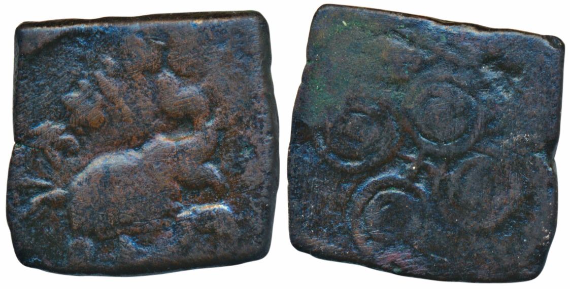 Satavahanas, Siri Satakarni, Copper Unit, 7.59g, obv. an elephant walking to right with upraised trunk with Brahmi legend ’Rajno Siri Sat(kanisa)’ above, rev. double orb Ujjaini symbol . Fine+. Ex. Todywalla Auctions 98 Lot No. 6. P. D. Chumble Collection.