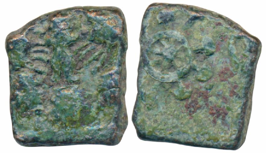 Satavahanas, Uninscribed, Vidarbha Region, Copper Unit, 2.07g, ’Gaja Lakshmi’ type, obv. Abhisheka Lakshmi sitting on a lotus, flanked by two elephants, rev. eight armed wheel. Very Fine, Rare.