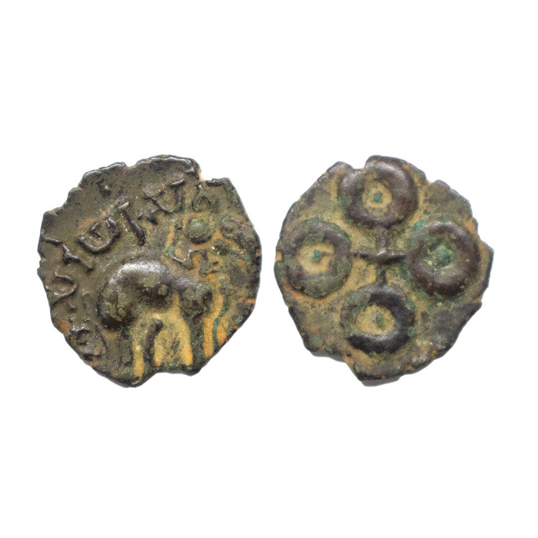 Satavahanas, Yajna Satakarni (c. 170-200 AD), Tarhala type, Vidarbha Region, Potin Unit, 11.56Grms, OBV: Elephant walking to right with trunk upraised (off flan) Brahmi legend on its back 'Siri Yajna Sata[kanisa]. REV: Four orb ujjaini symbol with dot in each orbs. (V.V. Mirashi # Studies in Indology Vol. III). Very Fine+.