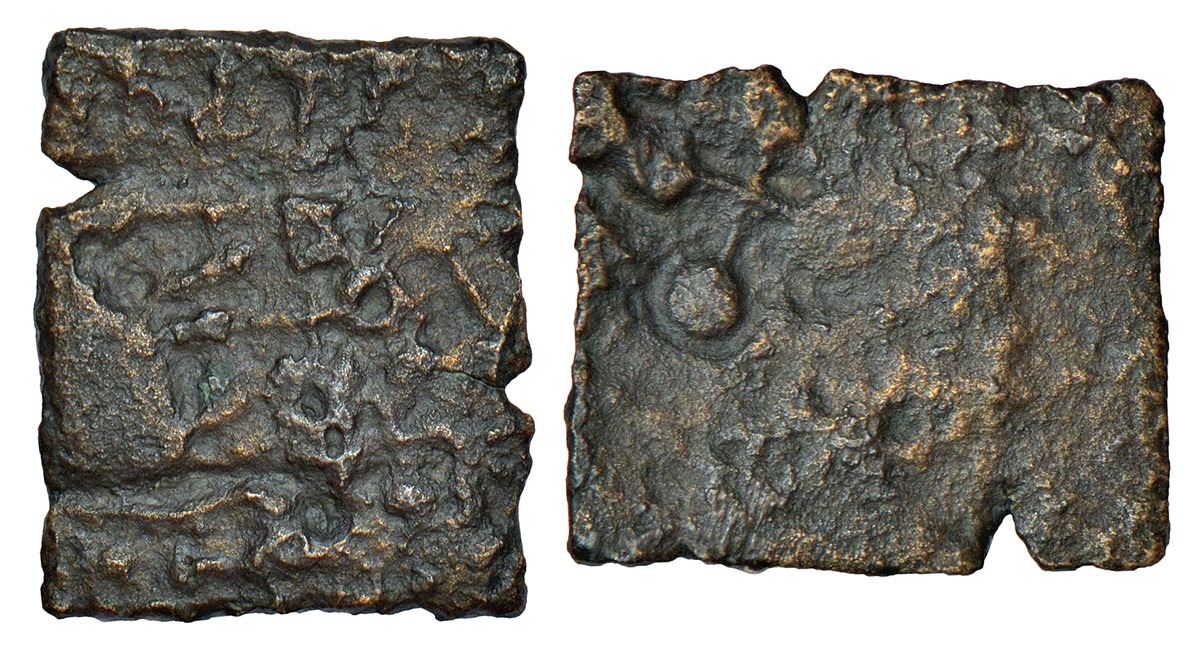 Satavahanas, copper punch-marked coin from Vidisha region attributed to Siri Sati (c.50-25 BC), same type as PAIC 2576 but half unit, 2.19g. Obv: five punches - modified 'Ujjain' symbol in centre, elephant to its left, triangle-headed standard to right, river with fishes below. Brahmi legend Raño Siri Sati(sa) punched at top. Rev: 'Ujjain' symbol with one orb modified with crescent as a single punch.
