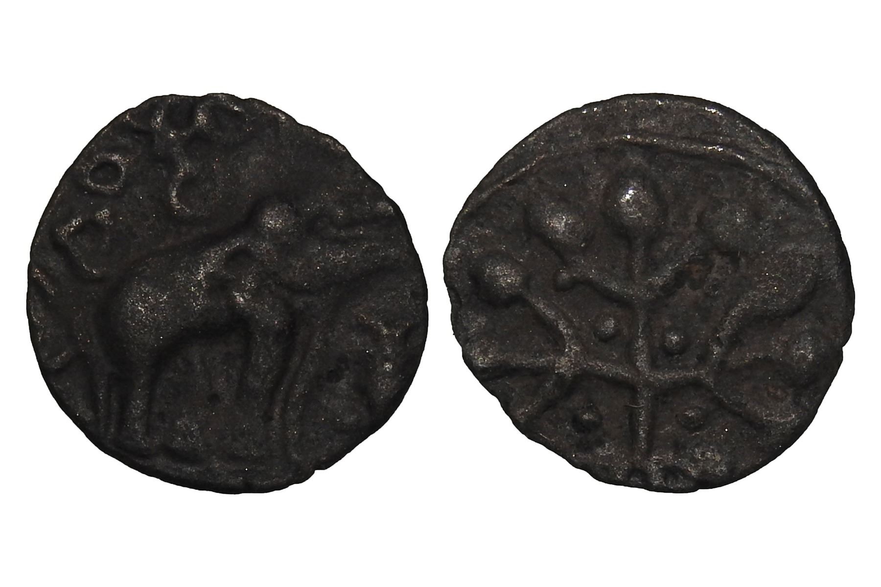 Satavahanas, 'elephant' type coin of arsenical Copper attributed to Gotamiputa Siri Satakani (c.60-84 AD) from Nasik region, similar to PAIC 2603, 1.84 grams. Obv: elephant facing to right, an 'Ujjain' symbol above its back and a vase in the front and wavy line below; Brahmi legend …ño Si… to left. Rev: a tree with solid leaves and fruits in a railing. Extremely fine, Scarce.