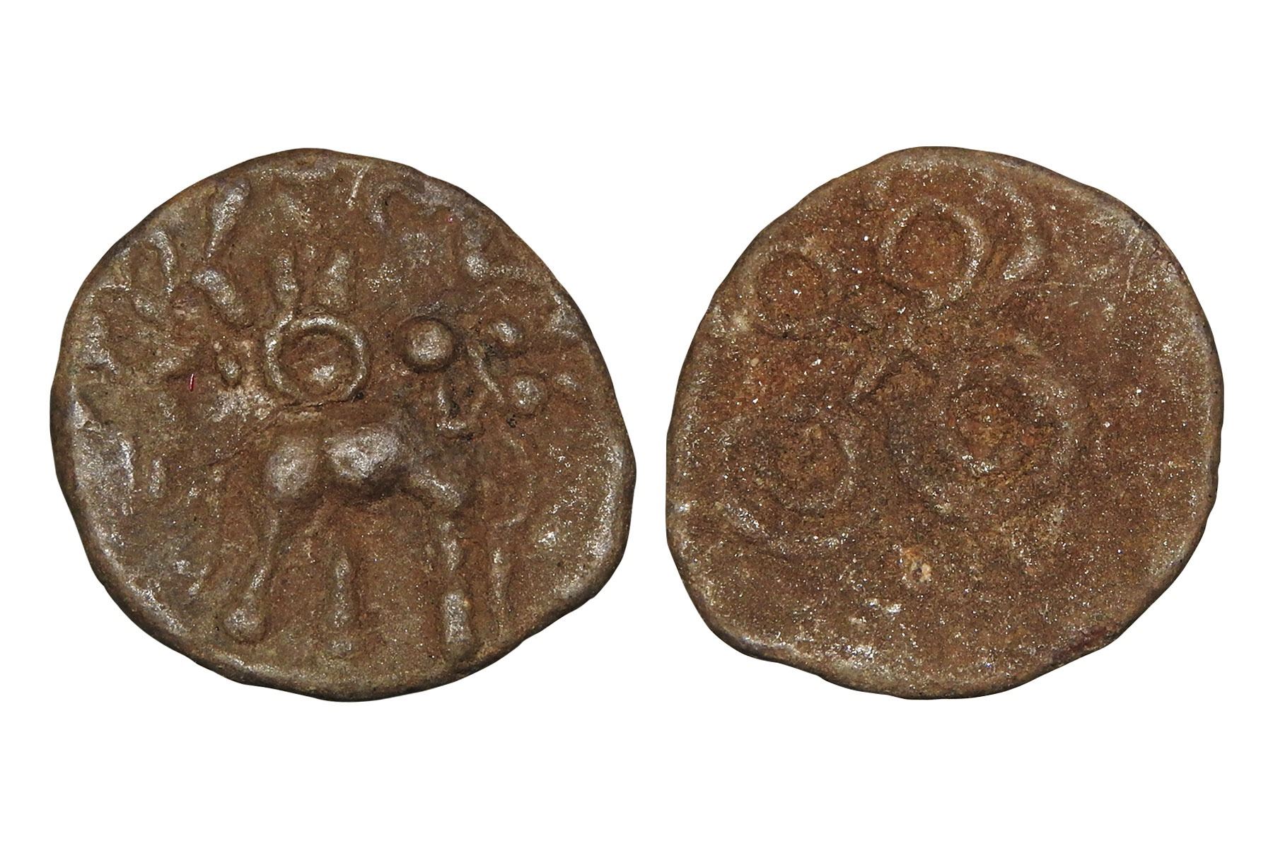 Satavahanas, uninscribed ‘elephant’ - type Lead coin attributed to Gotamiputa Siri Satakani (c.65-90AD), Vidarbha region, not listed in PAIC, 4.21 grams. Obv: elephant standing facing right with trunk raised; Nandipada above its back. Rev: ‘Ujjain’ symbol with concentric orbs. Very fine, Scarce.