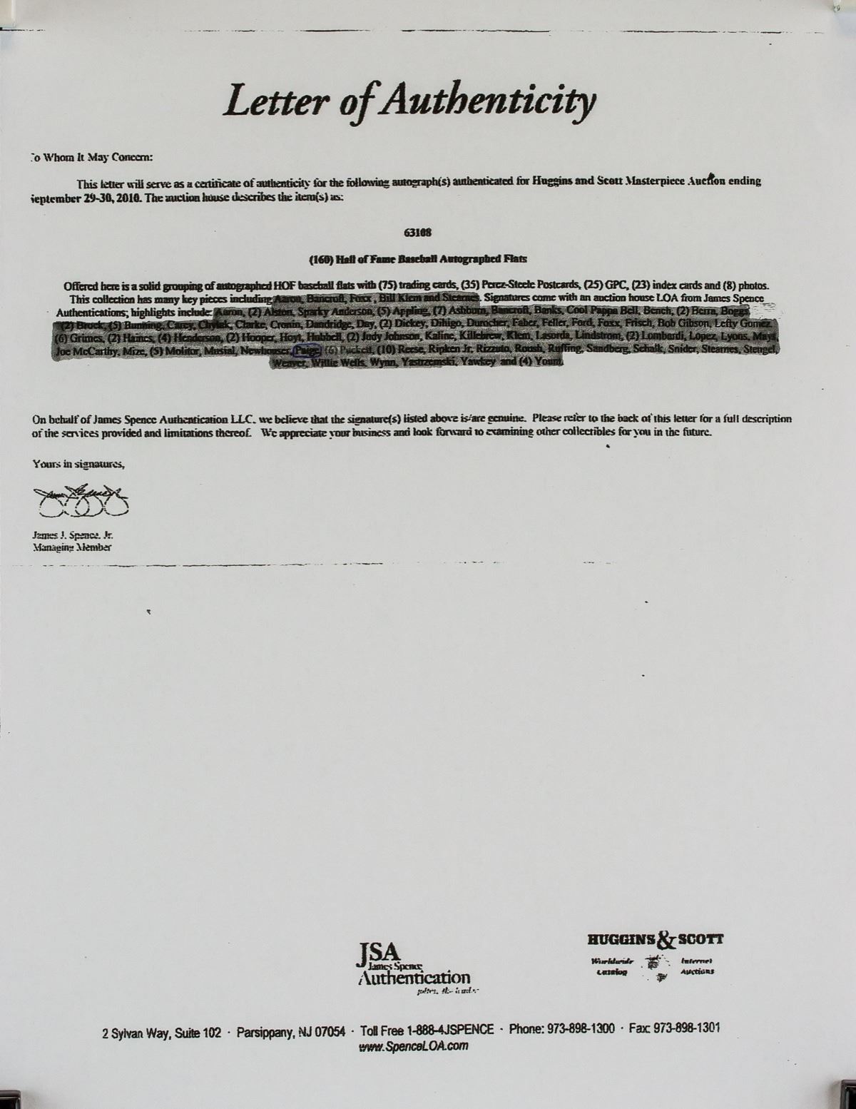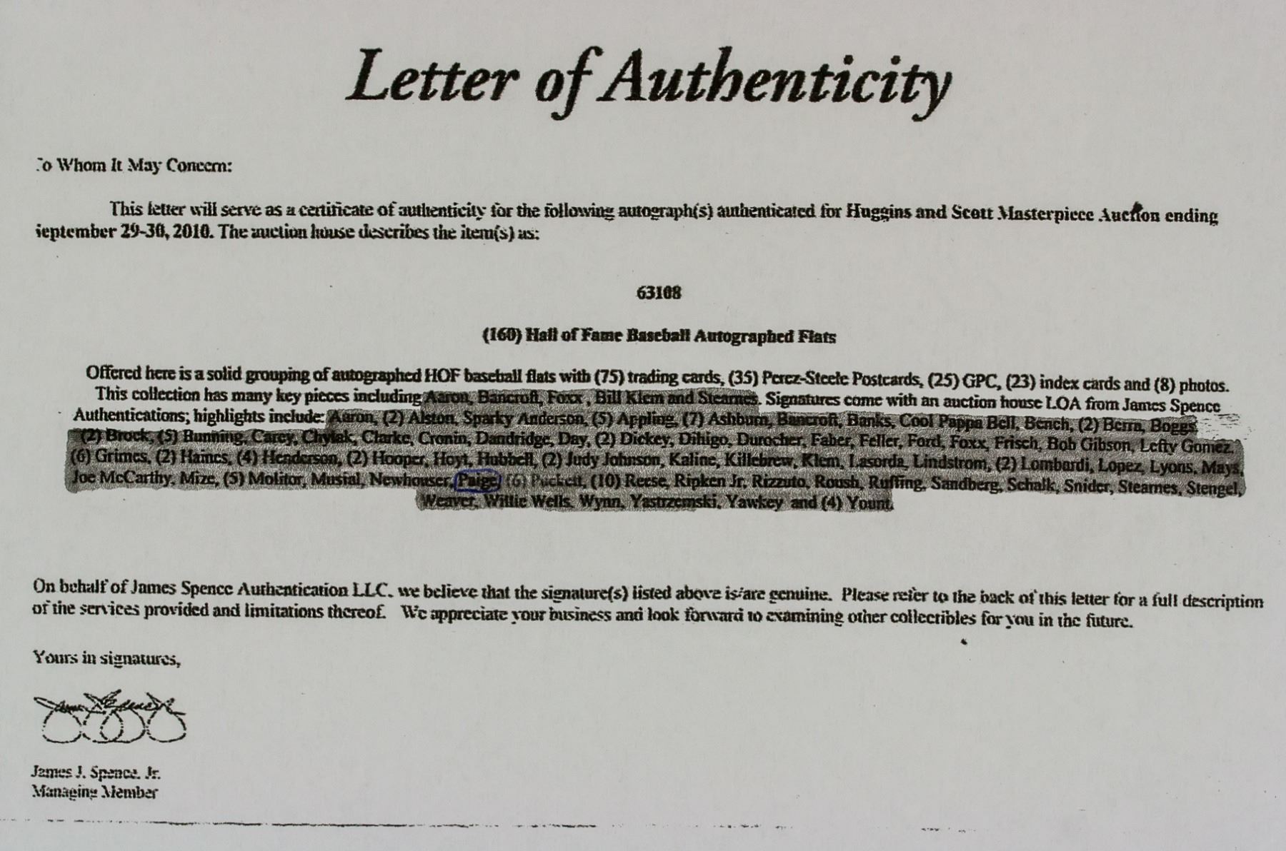 e) All descriptions appearing on-line are subject to any variation announced by the auctioneer, on-line or otherwise, prior to the time of sale. No representation is made in respect to any copyrights available to any purchaser. All prospective purchasers shall have an opportunity to inspect all lots prior to the time of the auction and it is recommended that they do so. Purchasers assume all risks by failing to inspect and/or have items and/or lots properly authenticated prior to purchase. Nothing within this contract shall limit the purchaser's recourse against an expert retained by them to determine authenticity. We are an auction house and/or small collectibles store only, and are unable to, and do not, guarantee the authenticity of any items listed for sale, or the condition of same, whether at auction or retail.