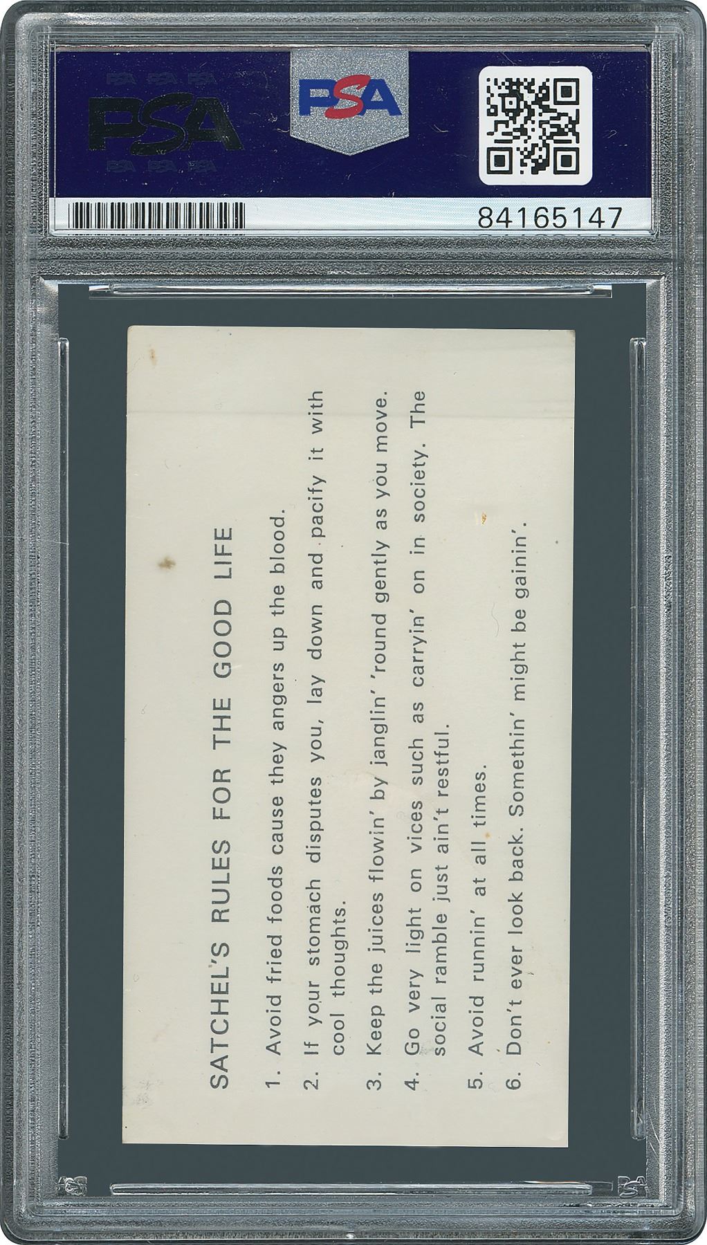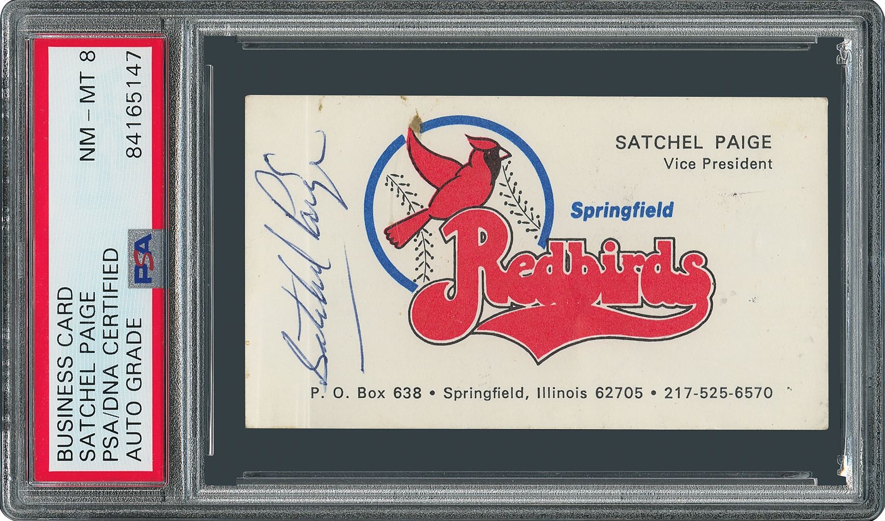 Graded and encapsulated by PSA/DNA NM-MT 8. Long after his playing days were finished and a decade after being the first Negro League ball player to enter the baseball Hall of Fame, Satchel Paige was hired as a Vice President of the Springfield RedBirds, AAA affiliate of the St. Louis Cardinals. Largely ceremonial, Paige was once again to be part of a baseball organization. The Hall of Famer signed his team business card in blue ball point, "Satchel Paige," grading at NM-MT 8 and encapsulated by PSA/DNA. With Paige passing away in 1982, there was not a lot of opportunity to have examples of his business card signed, making this encapsulated example very scarce.