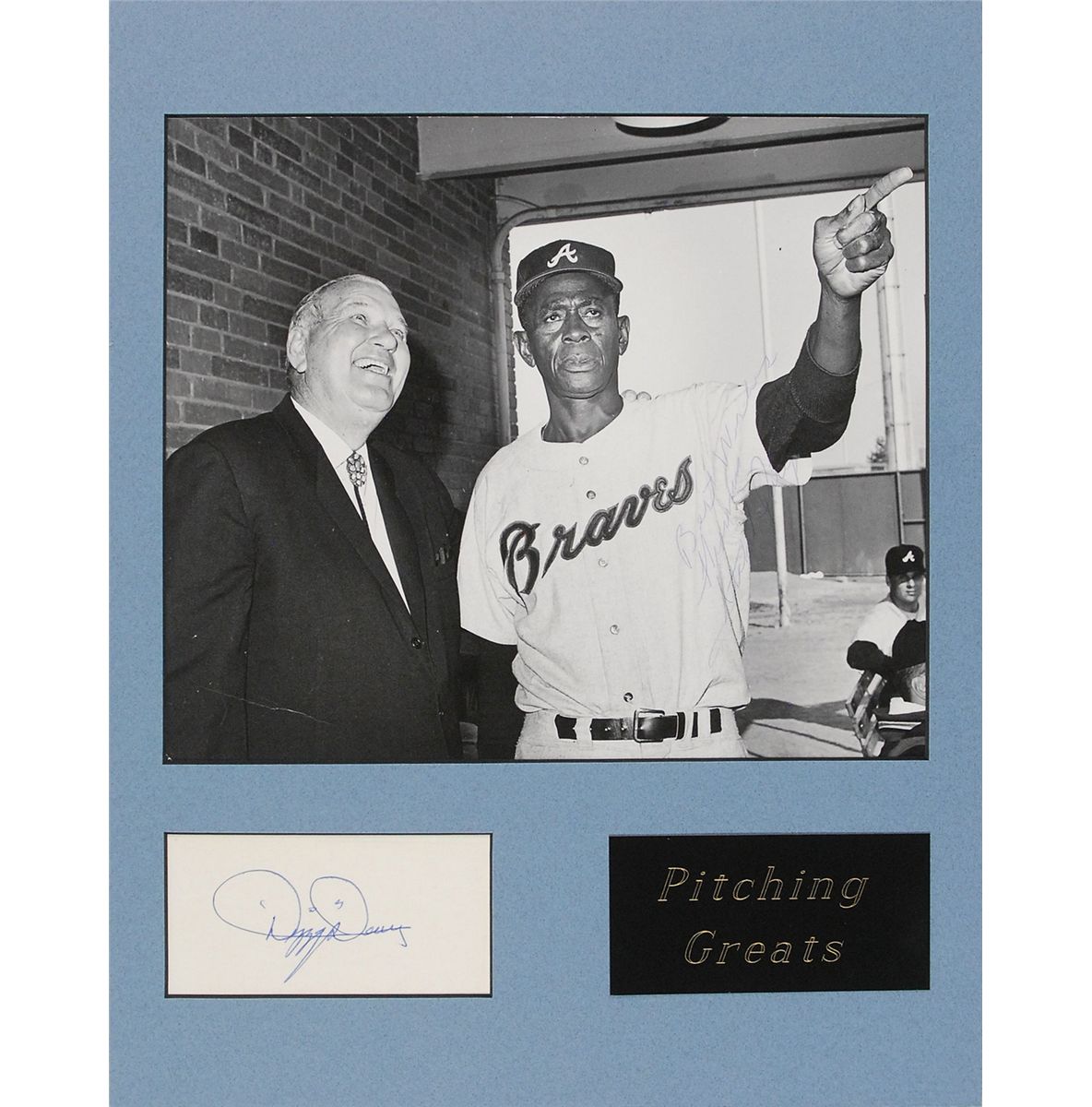Glossy 10 x 8 photo of Paige and Dean, signed and inscribed in blue ballpoint, “Best wishes Thomas, Satchel Paige”; and a ballpoint signature, “‘Dizzy’ Dean,” on an off-white card. Both are matted together with a small plaque to an overall size of 11 x 14. A couple creases to photo and light contrast to Paige’s signature, otherwise fine condition.