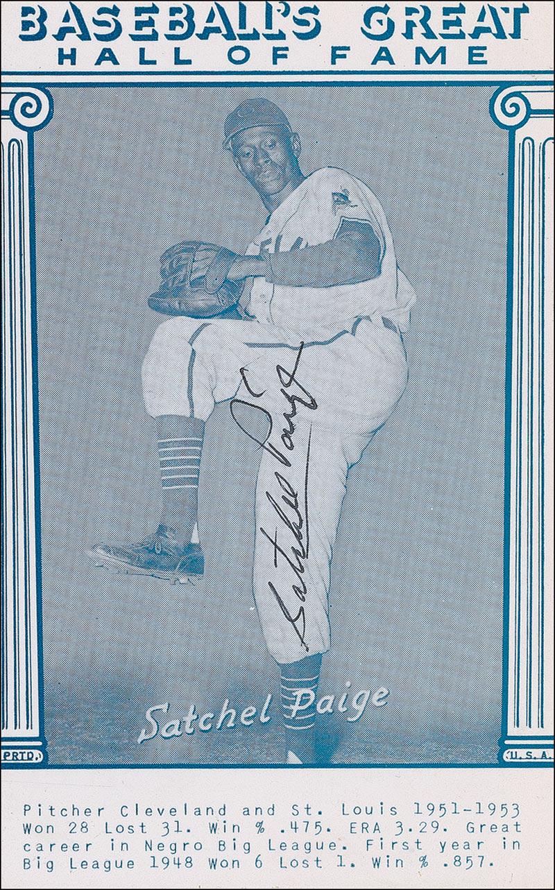 Baseball’s Great Hall of Fame exhibit card, 3.25 x 5.25, featuring an image of Paige in his Cleveland uniform, signed vertically in black ink. In fine condition.