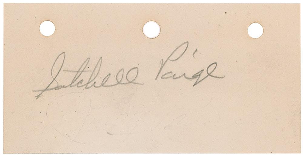 Vintage pencil signature, “Satchell Paige,” on an off-white 4.25 x 2.25 slip. Three punch holes to top edge, erased remnants of a signature or notation underneath, and some light wrinkling, otherwise fine condition.