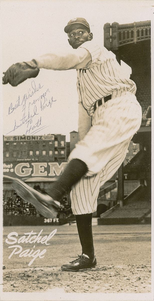 Glossy 5 x 10 full-length photo of Paige winding up for a pitch, signed and inscribed in black ballpoint, “Best Wishes from, Satchel Paige, to Hatt.” Affixed to a slightly larger sheet. In fine condition, with trimmed edges and a small area of irregularity to the emulsion in the upper right corner.