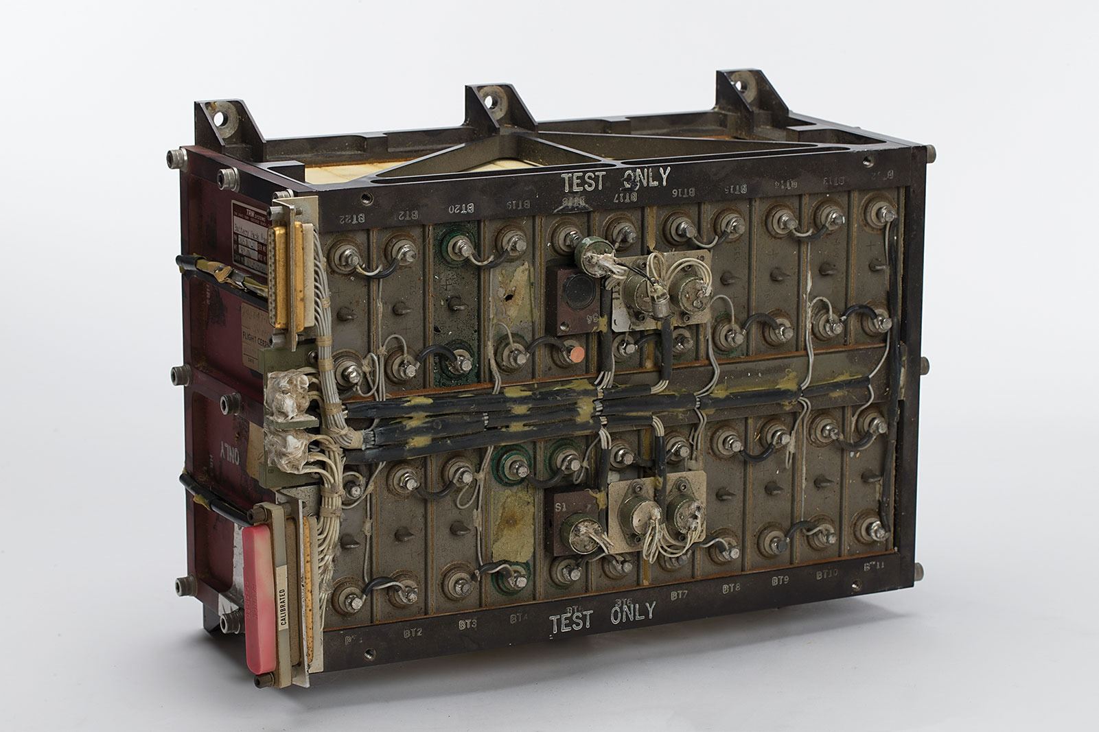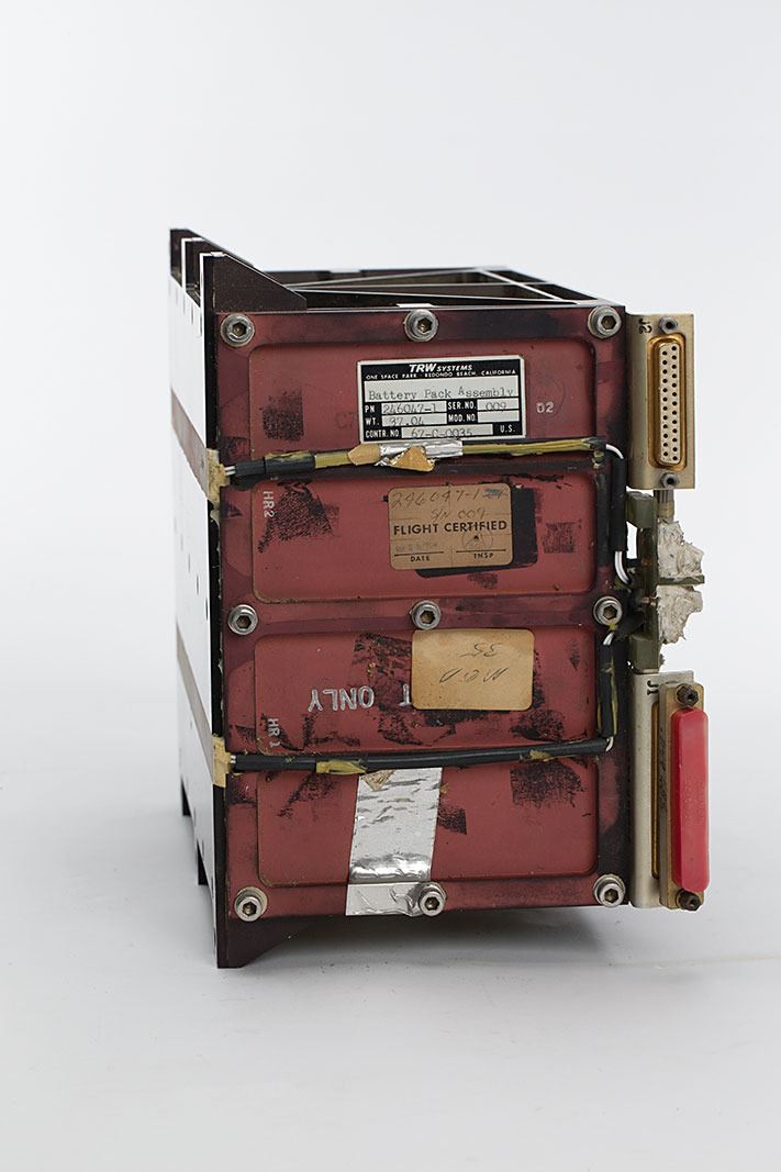 Satellite Battery Pack Assembly, measuring 8.5? x 11? x 6? and weighing approximately 37 pounds, featuring a TRW Systems tag on one end, reading: "Battery Pack Assembly, PN 246047-1, Ser No. 009, Wt. 37.04, Contr. No. 67-C-0035." A "Flight Certified" label, dated May 26, 1970, is applied below. The chassis is marked "Test Only" on the sides and ends. In fine condition. An interesting piece which may have some gold on it.
