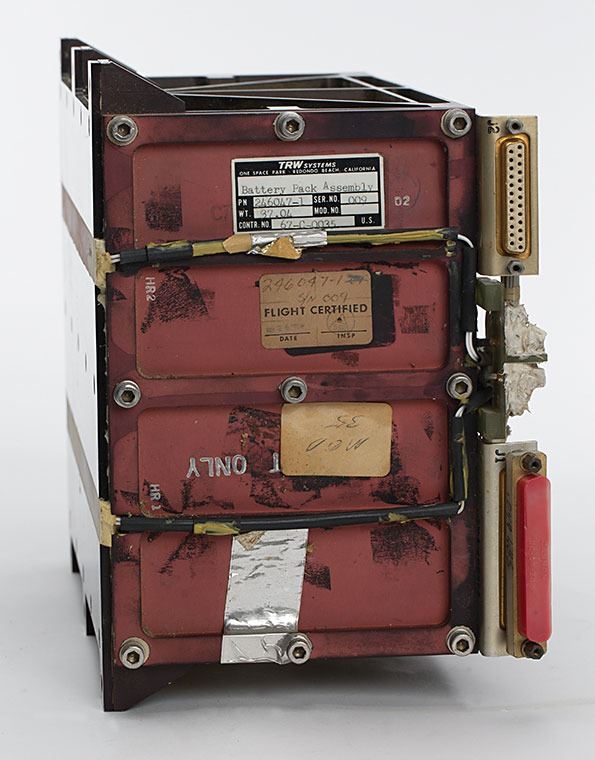 Satellite Battery Pack Assembly, measuring 8.5? x 11? x 6? and weighing approximately 37 pounds, featuring a TRW Systems tag on one end, reading: "Battery Pack Assembly, PN 246047-1, Ser No. 009, Wt. 37.04, Contr. No. 67-C-0035." A "Flight Certified" label, dated May 26, 1970, is applied below. The chassis is marked "Test Only" on the sides and ends. In fine condition. An interesting piece which may have some gold on it.