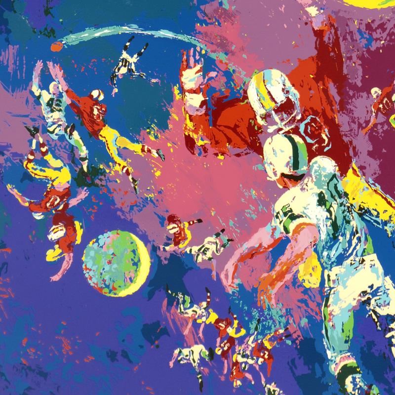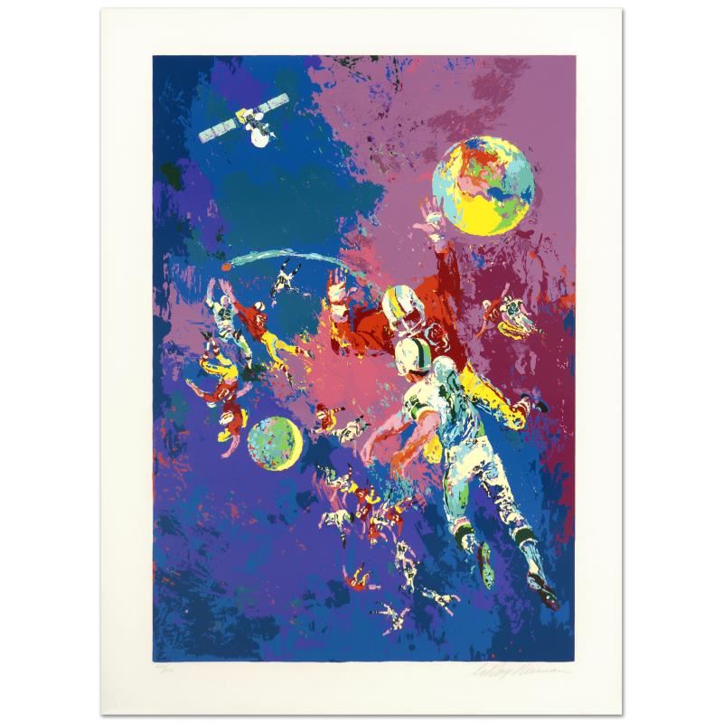 "Satellite Football (1982)" is a limited edition serigraph on paper, numbered and hand signed by Leroy Neiman (1921-2012)! Includes Certificate of Authenticity! Measures approx. 30" x 41.5" (with border), 24" x 35" (image). ** Due to this piece having been stored for an extensive period of time (about 30 years), the border is slightly discolored. It is otherwise in good condition. **