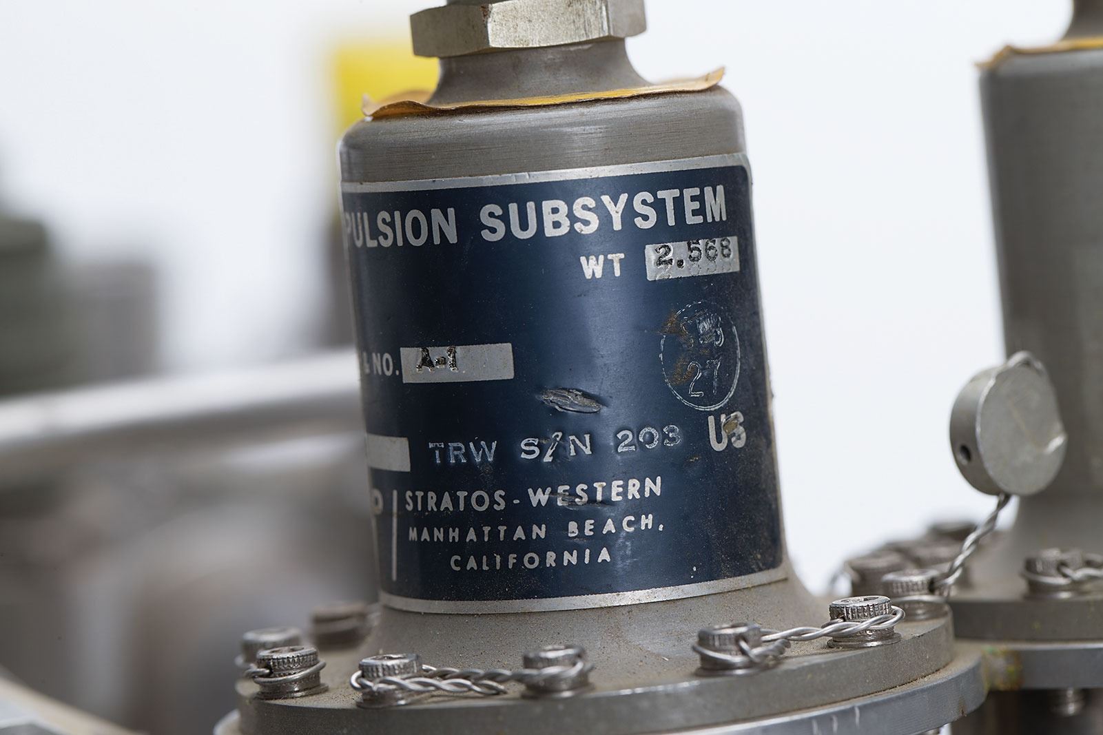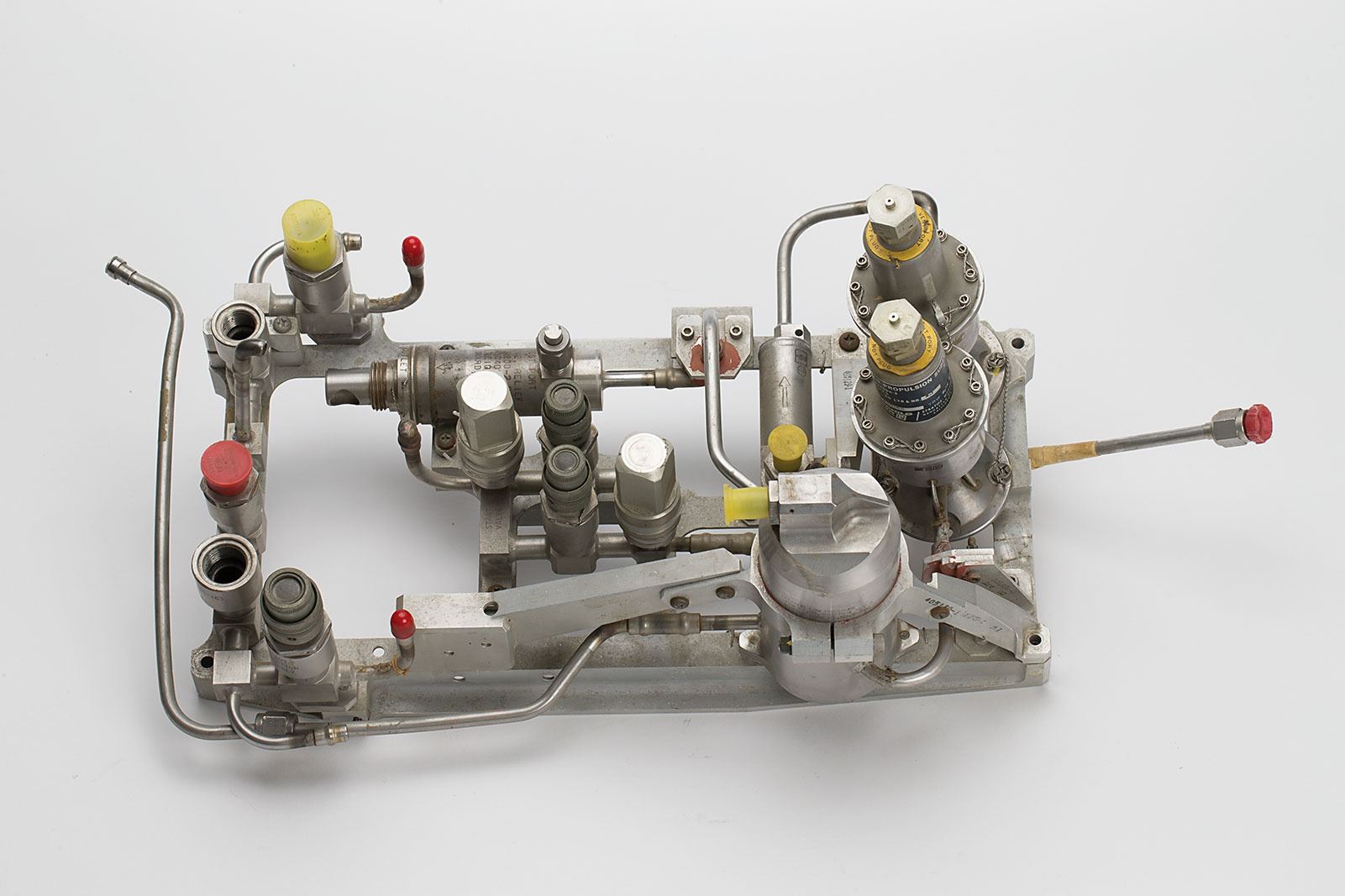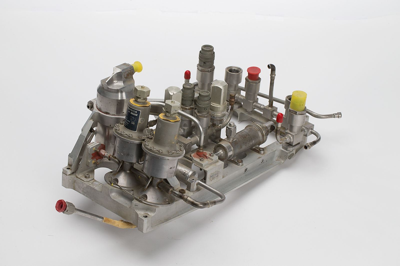 Satellite Helium Regulator Assembly used for spacecraft attitude control, measuring 20? x 10? x 9?, with a wraparound Fairchild Hiller/Stratos tag on the outlet port, reading: "Regulator-Propulsion Subsystem, Stratos PN 428000-3, Wt 2.568, TRW PN C402347-1, Rev NC, EO Ltr & No. A-1, Ser No. F840166, TRW S/N 203." The unit is comprised of valves, ports, and piping set upon a metal bracket. In fine condition. An interesting piece which, though associated with an unidentified spacecraft, utilizes components shared with the Apollo program.