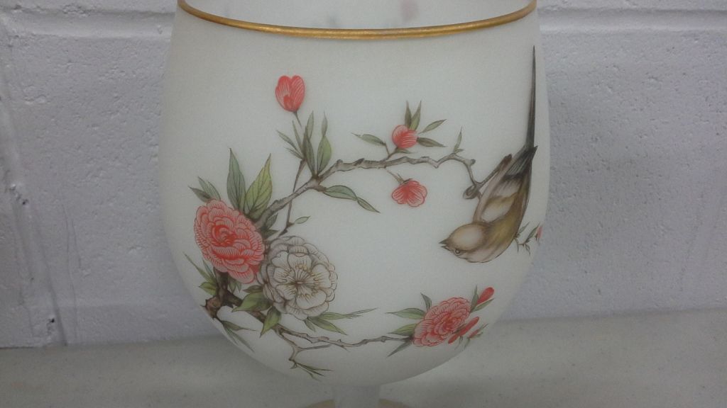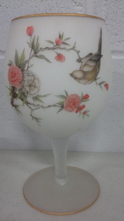 Satin Glass Bird and Flower Motif Stemmed Bowl (8.75" high)