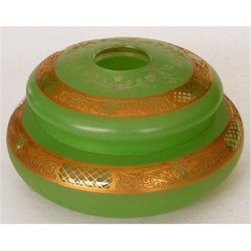 </font></strong>This green frosted glass hair receiver is signed HAWKES on the base. The green frosting is cased onto crystal. The lid and jar are cut to clear with a floral design on the lid and a lattice design on the jar. Both lid and jar are etched and sport a gilded gold band. With only very slight wear to the gold both lid and jar are in excellent condition. </font>