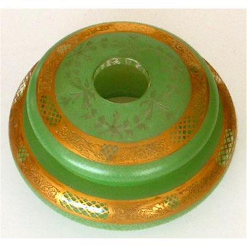 This green frosted glass hair receiver is signed HAWKES on the base. The green frosting is cased onto crystal. The lid and jar are cut to clear with a floral design on the lid and a lattice design on the jar. Both lid and jar are etched and sport a gilded gold band. With only very slight wear to the gold both lid and jar are in excellent condition.