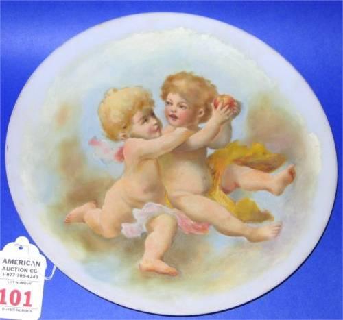 Exquisite Victorian era French Satin Glass plate (polished pontil) hand painted Cherubs. 11.75" diam. 3lbs (5-101)