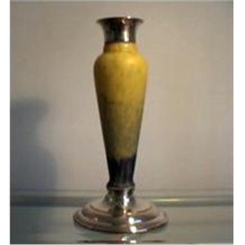This Blue & Yellow Satin Glass Vase has a Elkington Silver Plate Base & Rim. 1920's A special find