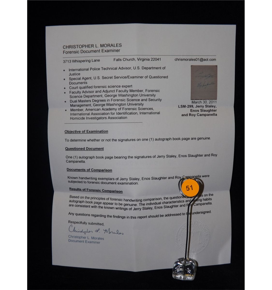Satley, Slaughter & Campanella Die Cut Autographs with Additional Autograph on Reverse (Unknown). Appraised or estimated retail value $500. COA by Christopher Morales. All Sales Final. Please see terms and conditions of auction.