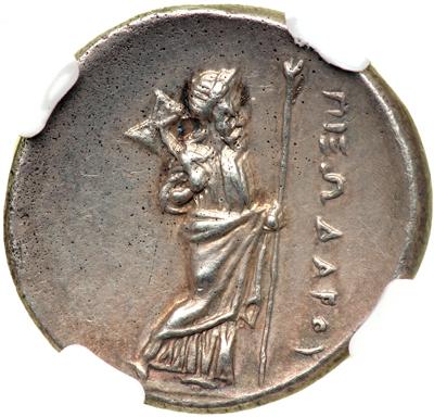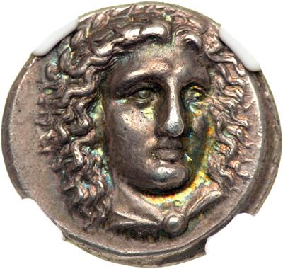 Satraps of Caria. Pixodarus, c. 340-334 BC. AR Didrachm (7.09 g). Laureate head of Apollo facing. Reverse: Zeus Labraundos standing right, holding labrys and spear. Dewing 2381. NGC graded AU: Strike 5/5; Surface 3/5. Our grade is About Extremely Fine.