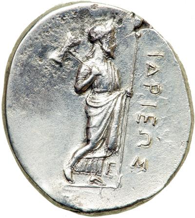 Satraps of Karia. Hidrieos, c. 351-344 BC. AR Tetradrachm (14.33 g). Head of Apollo three-quarter facing to right, wearing laurel wreath, drapery and brooch at neck. Reverse: Zeus Labraundos standing right, holding labrys and reversed spear; "E" and dynast's name in field. Traité II 100; SNG Cop Supp. 340; BMC p. 183, 1; SNG von Aulock 8046. Rare. Cleaned with some porosity on obverse and upper quadrant of reverse; otherwise. Choice Very Fine.