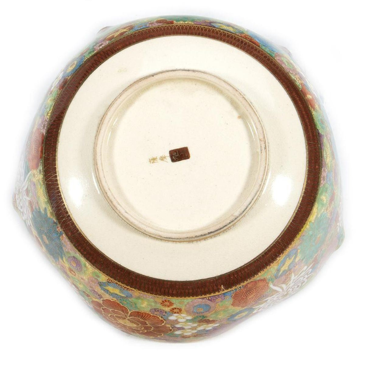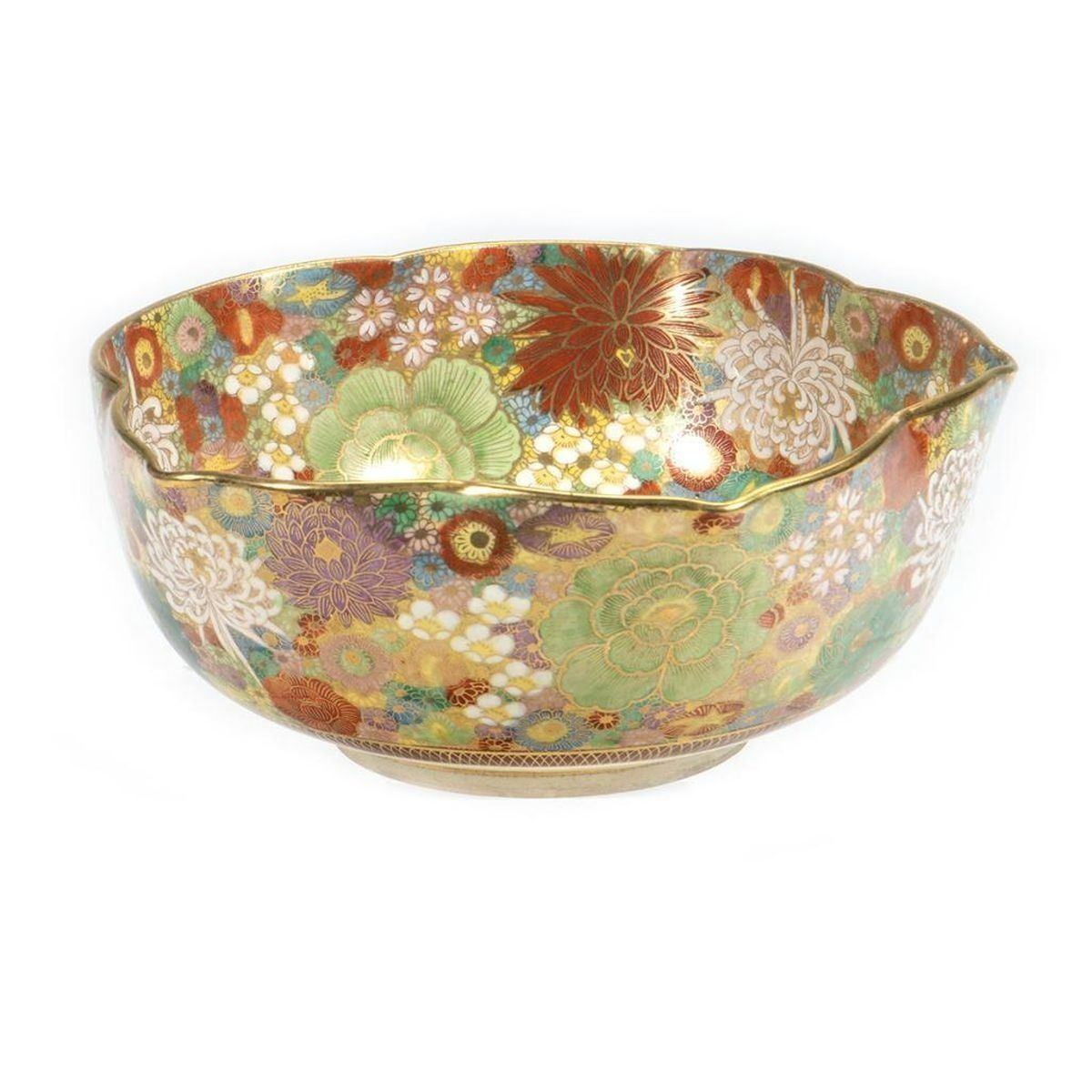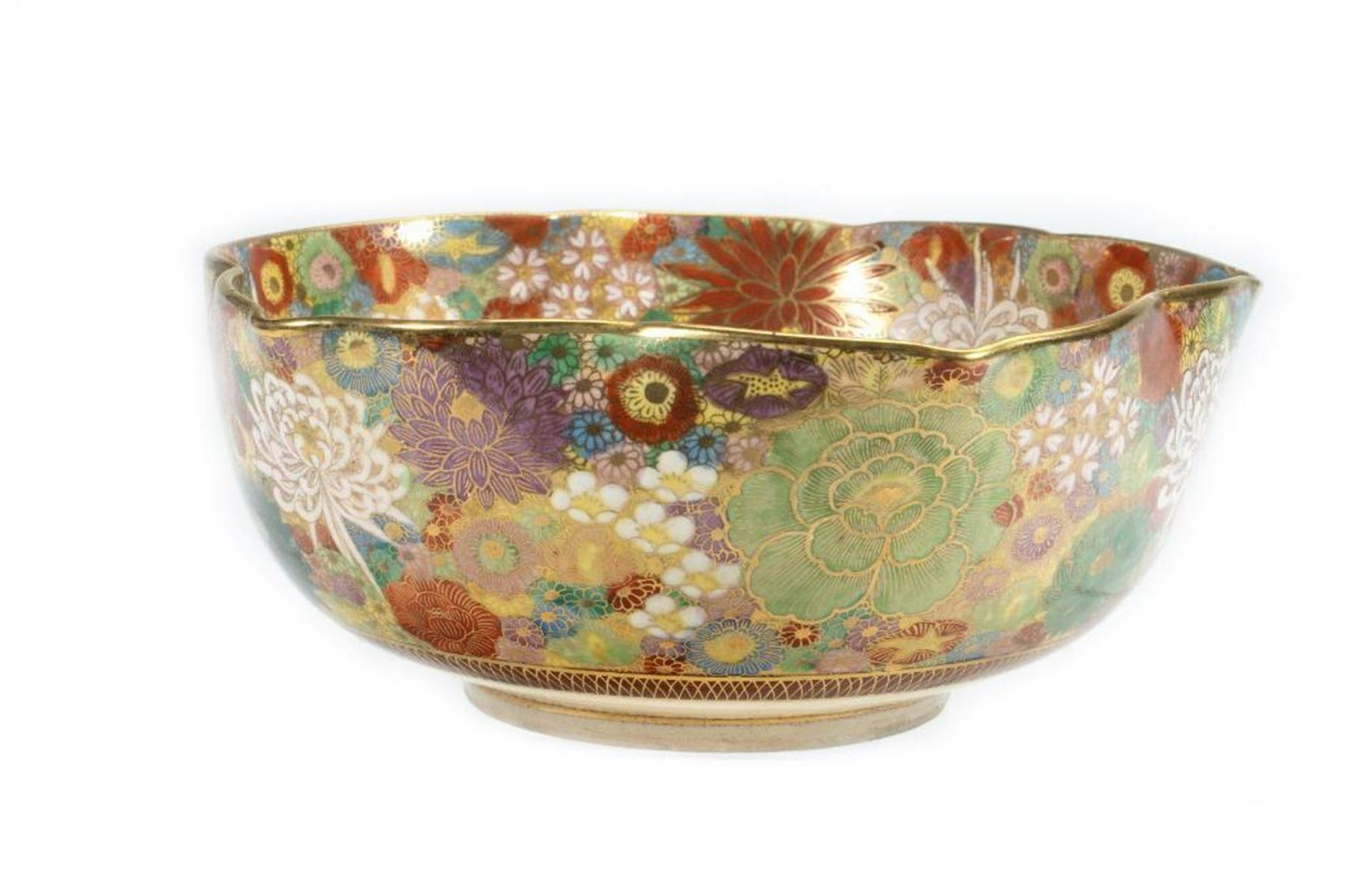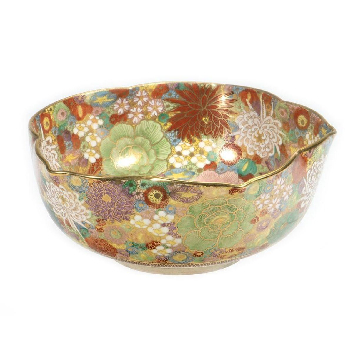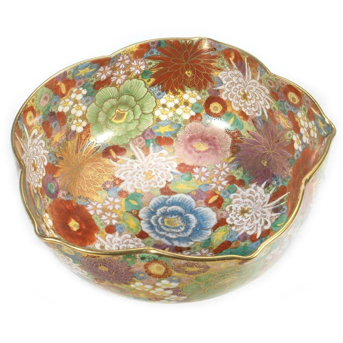 The lotus-form bowl with dense floral and gilt decoration. 3in. h. 7 1/2in. d. Condition: Very good, no chips or cracks.