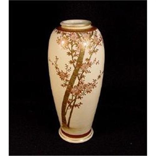 An elegant Satsuma vase, cream background, decorated with the trunk and branches of a cherry blossom tree. Typical Satsuma gilded outlines and diaper pattern to top and base. Vase measures 21.5cm high (8.1/2 inches), and is 9cm diameter at its widest point (3.5/8 inches). It bears the crest mark of the Prince of Satsuma and the mark of Japan. Probably Meiji period. Excellent condition. Some wear to the gilding around the neck opening.